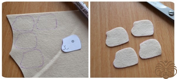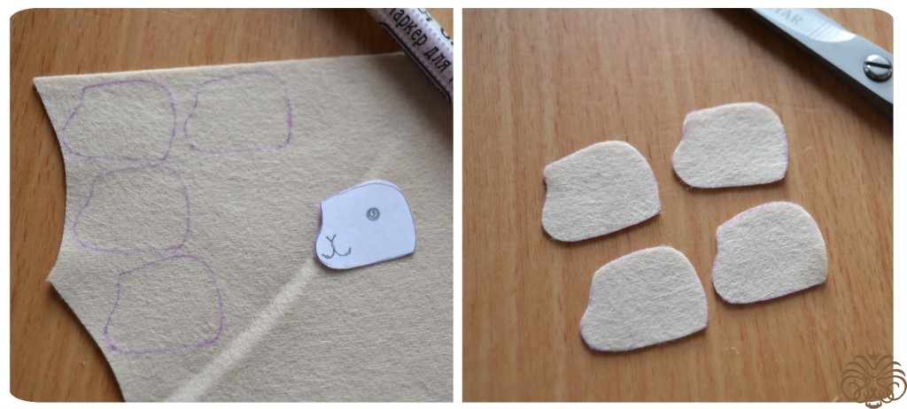 На бежевом фетре мы обводим деталь мордочки 4 раза. Вырезаем