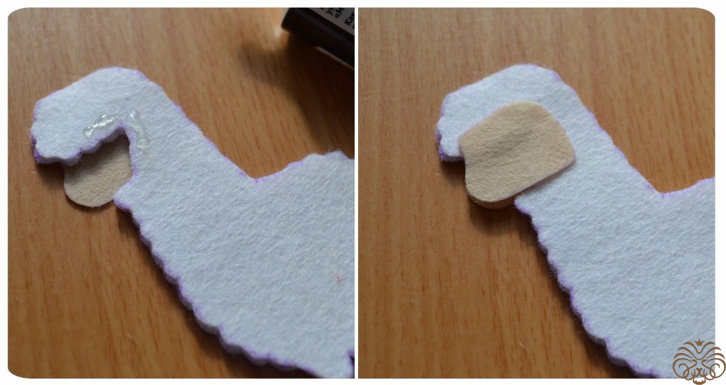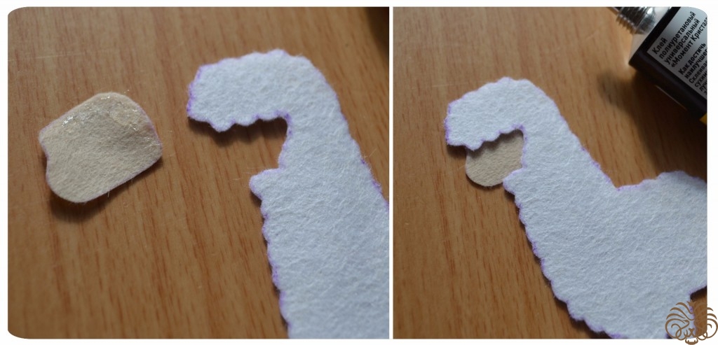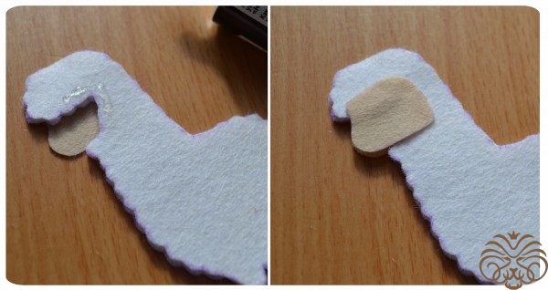 На внутренние края белой детали (там где будет мордочка) наносим немного клея Момент Кристалл. Затем сверху прикладываем еще одну деталь бежевой мордочки, так чтобы она совпадала с силуэтом нижней уже приклеенной деталью бежевой мордочки. Такой порядок приклеивания позволит нам ровно приклеить детали мордочки, так чтобы они совпадали при сшивании