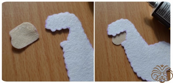 Берем одну из вырезанных мордочек и наносим на внутренние края немного клея Момент Кристалл. Сверху кладем одну из вырезанных деталек тела, так что бы мордочка и тело гармонично сочетались. Клей здесь играет лишь роль временного скрепления, поэтому не нужно наносить много клея и тщательно склеивать детали