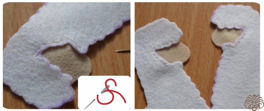 Теперь давайте попрочнее закрепим нашу мордочку у альпаки, для этого пришьем ее белыми нитками  швом "назад иголка", как это показано на схеме, к телу альпаки. Это нужно сделать как на лицевой детали, так и на задней