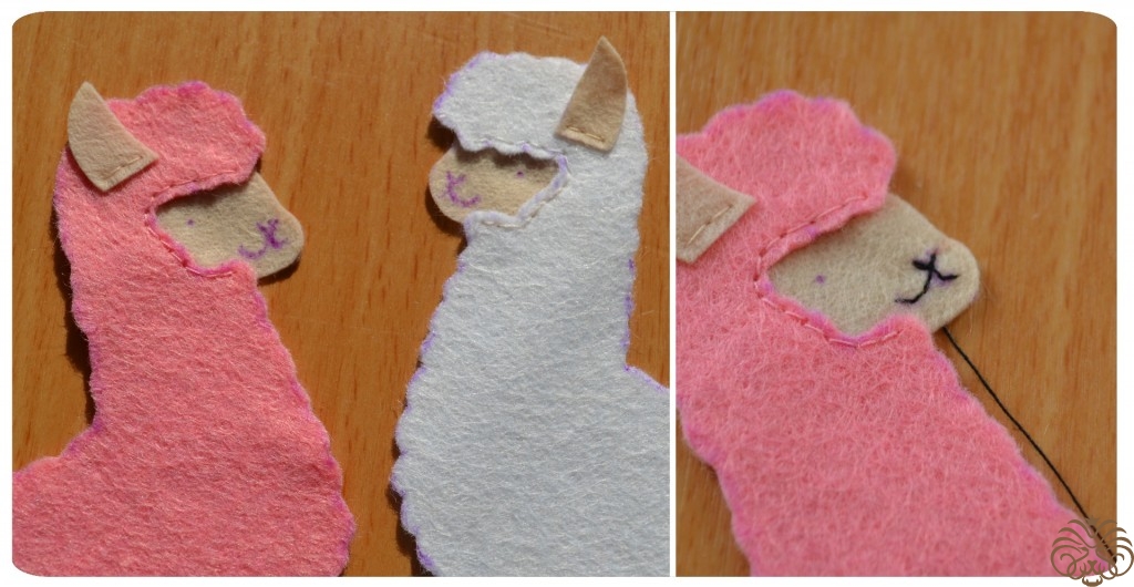 Самоисчезающим маркером нарисуем будущие очертания мордочек альпак. Вышиваем линии рта швом "назад иголка" черными нитками