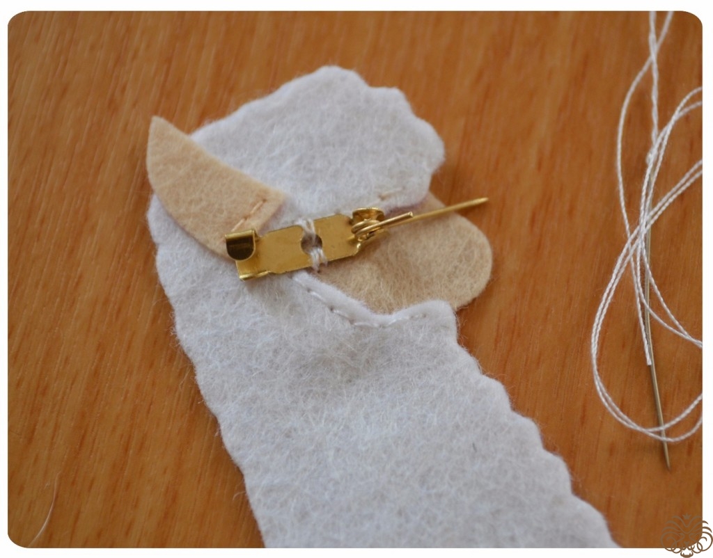 На задних деталях альпак мы пришьем крепежи брошек. Для этого мы кладем крепеж на место, где мы планируем его пришить и  открываем его для удобства пришивания