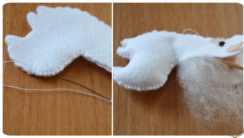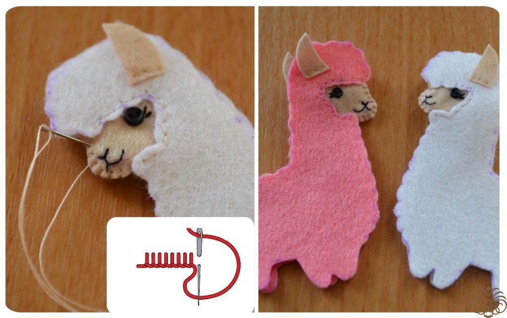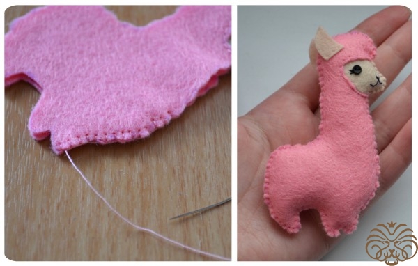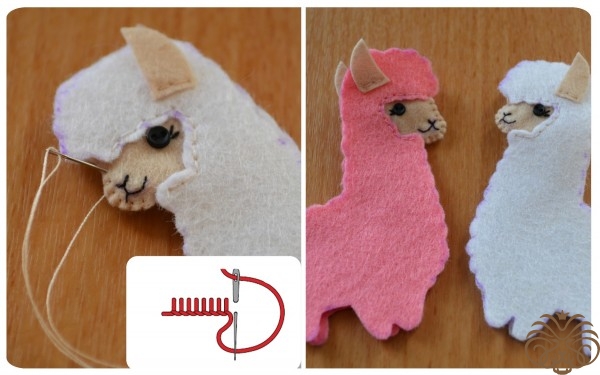 Теперь берем уже белые нитки и начинаем сшивать все тело альпаки обметочным швом. Постепенно набиваем брошку синтепоном