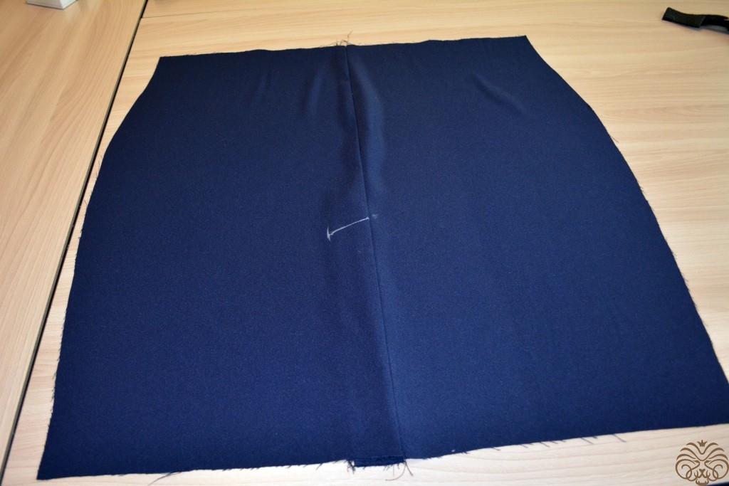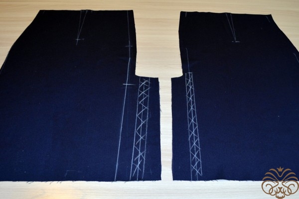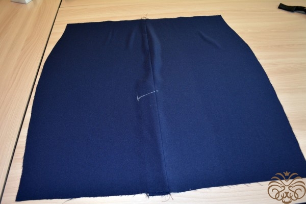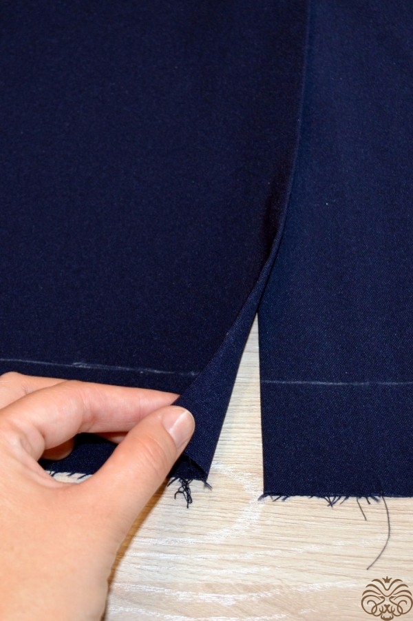 4. Наложить полотнища лицевой стороной вовнутрь, уравнивая средний срез выше шлицы, а место шлицы уравниваем по среднему шву.