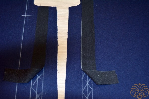 2. Те места, что заштрихованы необходимо продублировать клеевым материалом, ширина полоски 3-4 см. На левом полотнище делим припуск пополам и приклеиваем полоску, совмещая эту линию с серединой клеевой полоски. На правом середина клеевой полоски совпадает с линией сгиба шлицы.