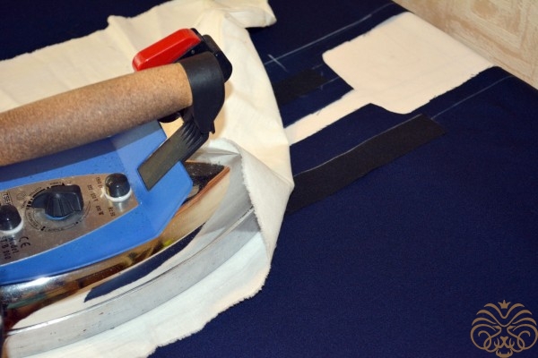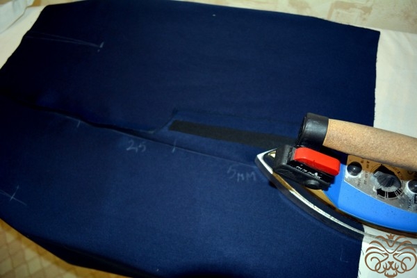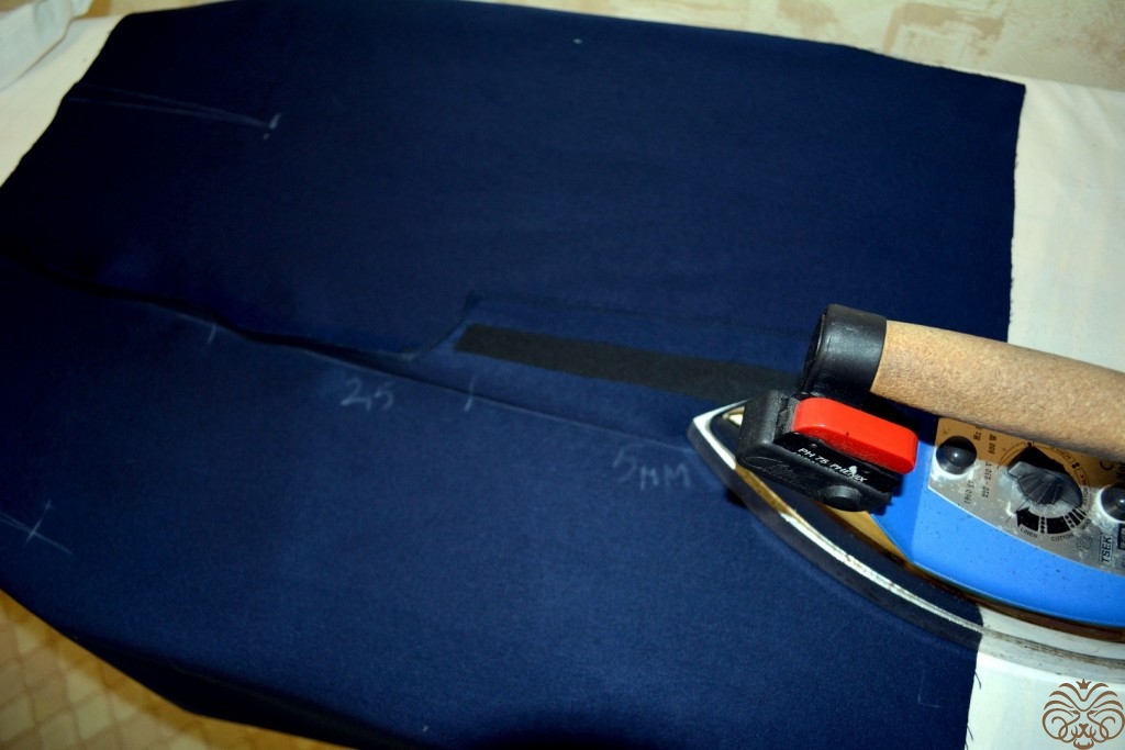 6. Шлицу заутюживаем на правую сторону. Так как у меня в верхней части будет обрабатываться молния, ее я разутюживаю. Припуск на левом полотнище перегинаем пополам и приутюживаем