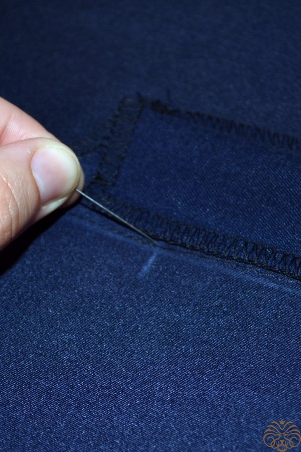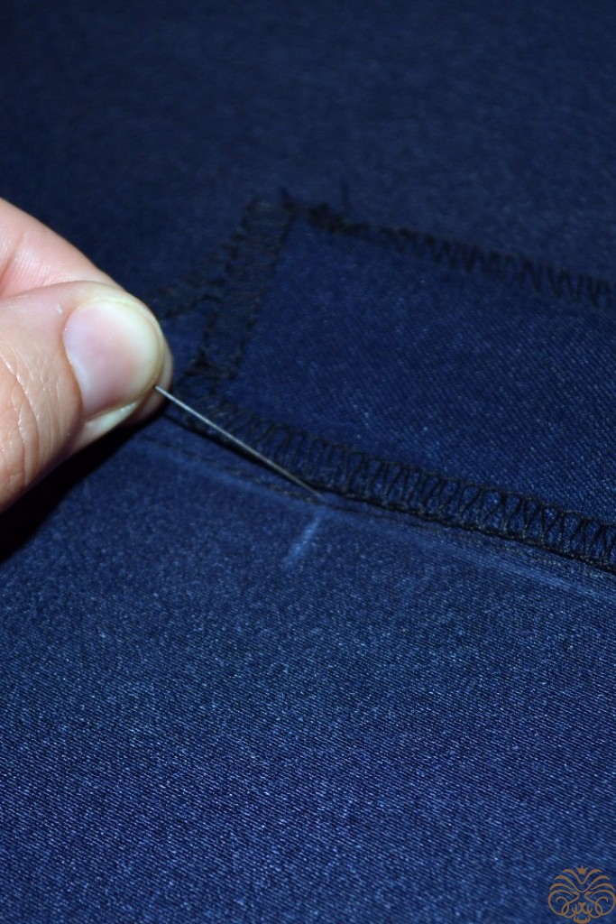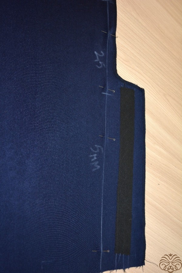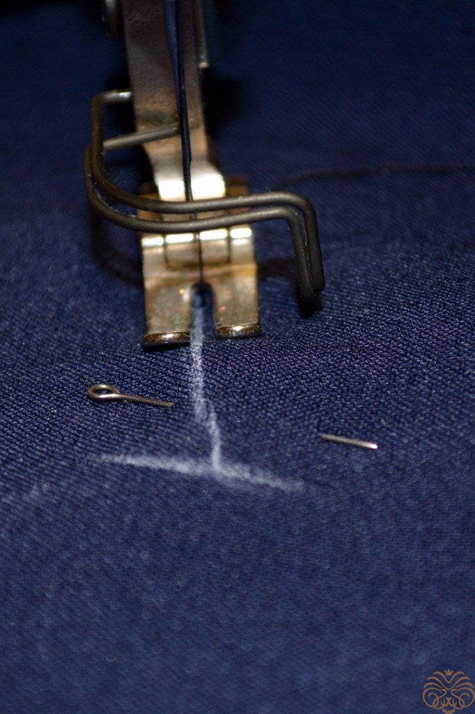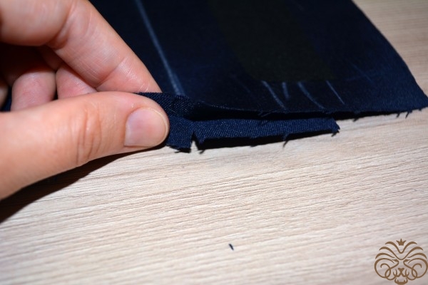 8. Чертим наклонную линию. Закрепляем припуски иглой и выполняем отделочную строчку по лицевой стороне на сквозь.