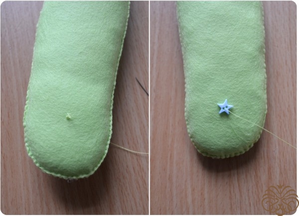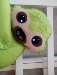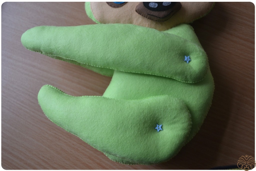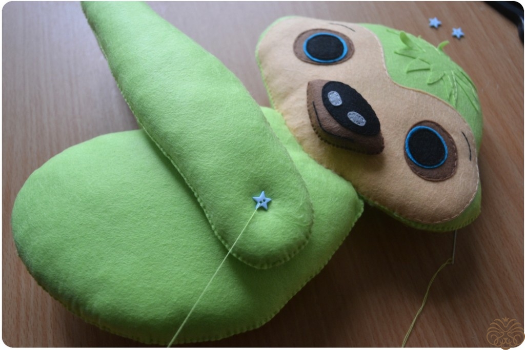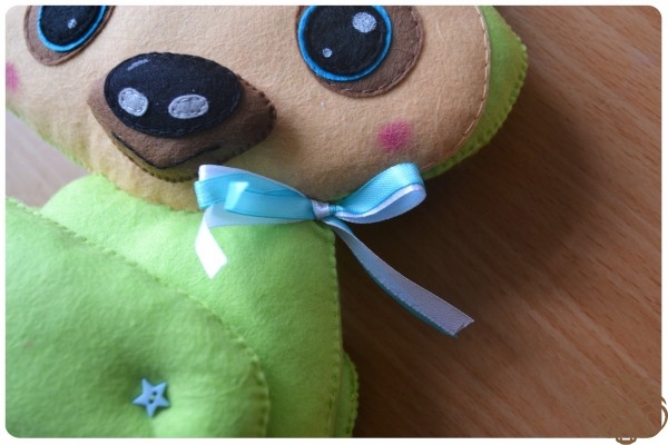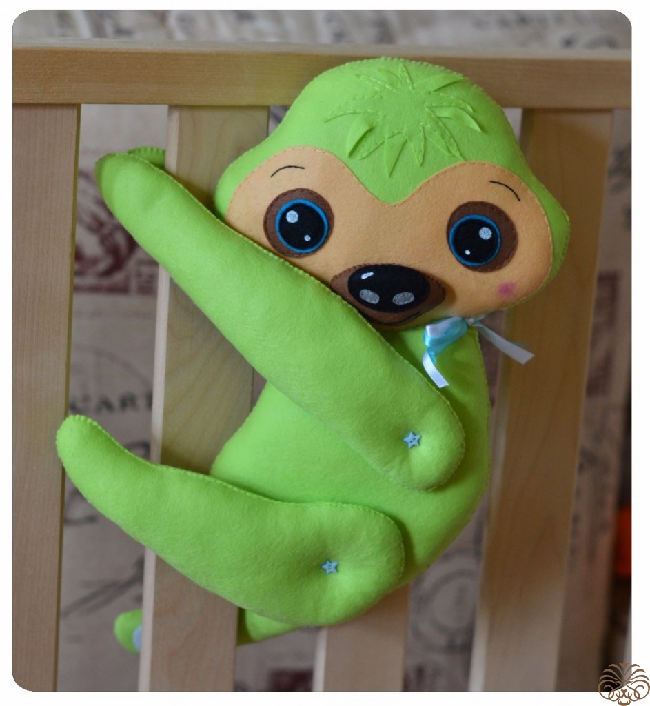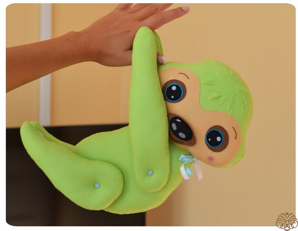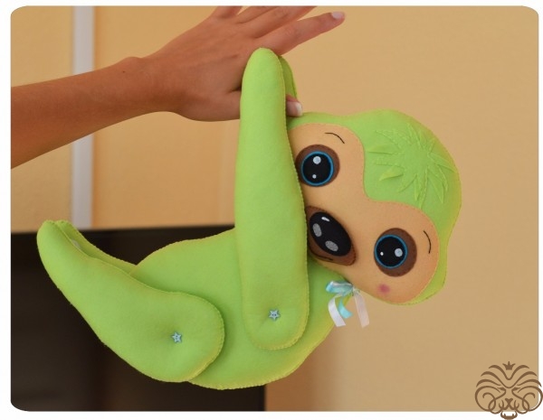Мне показалось, что в нашем ленивце слишком много салатового, поэтому я пришила ему еще и бантик сбоку, который сочетается с голубыми пуговками на лапках. А быть может ваш ленивец - девочка, и вы пришьете ей бантик или цветочек на голову?