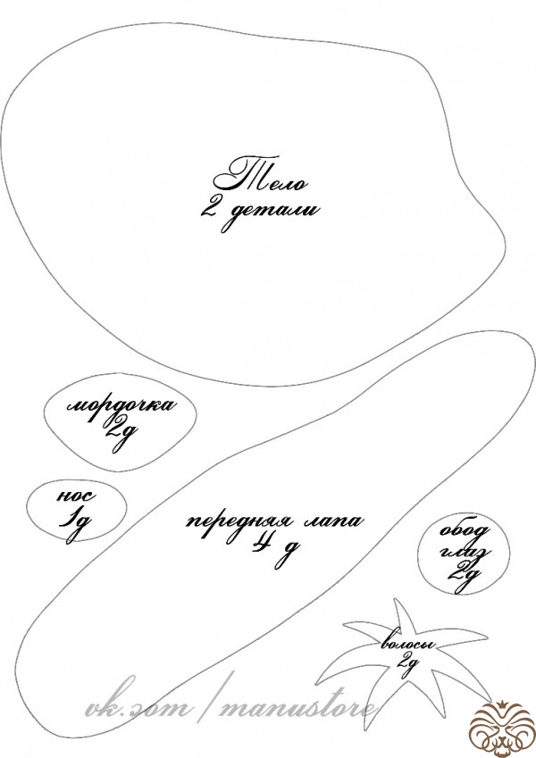 Из черного фетра по выкройке вырезаем нос. Прикладываем его к мордочке и пришиваем черными нитками швом "назад иголка"