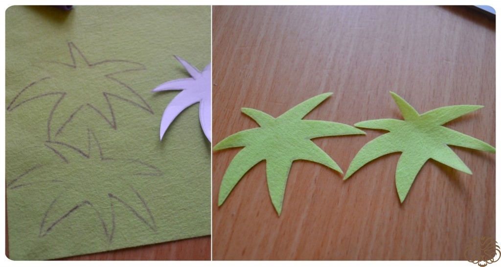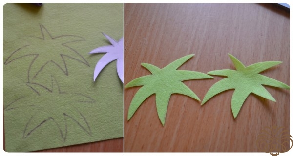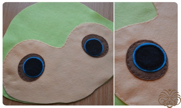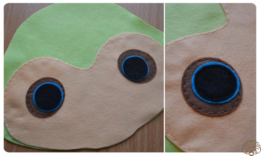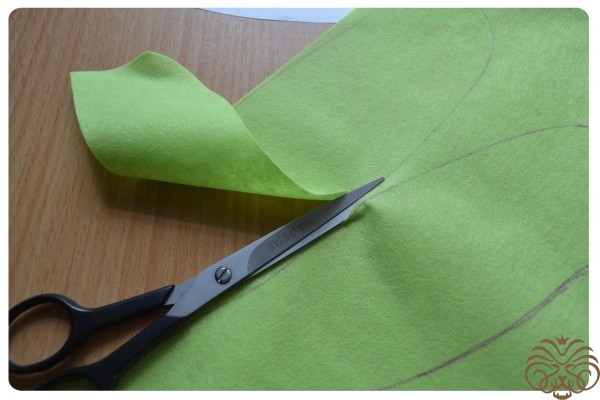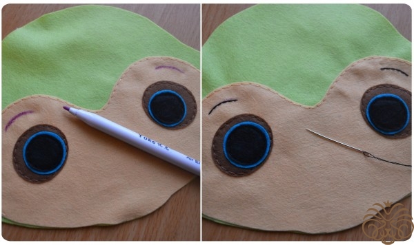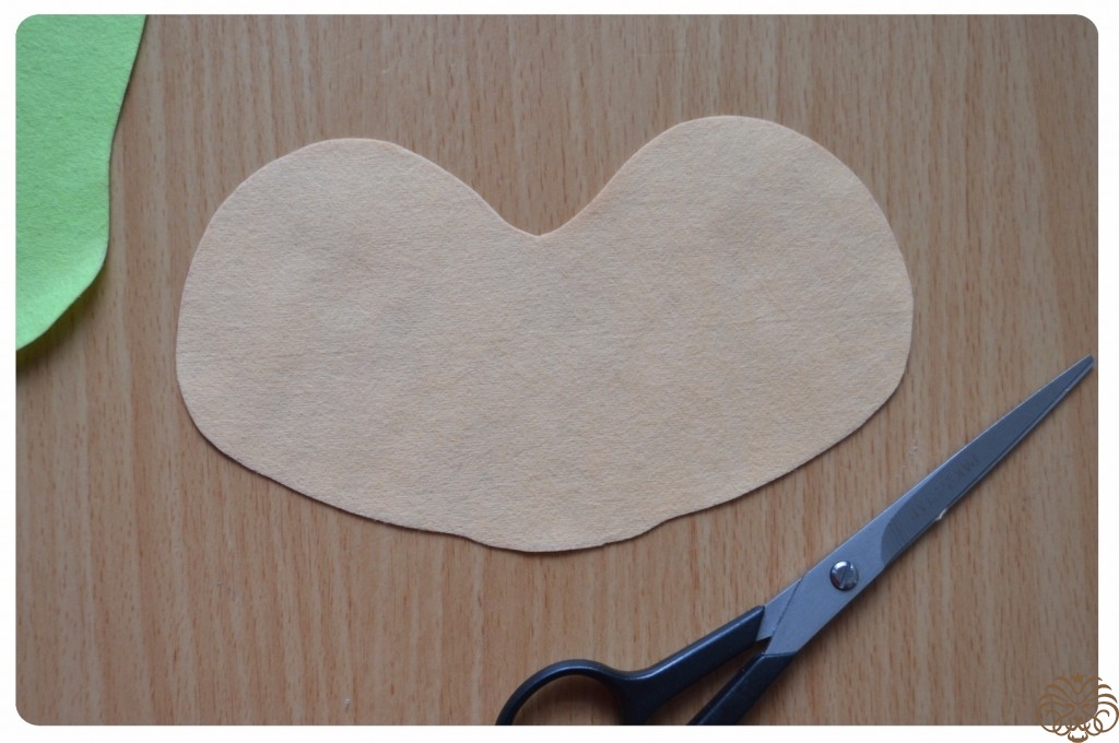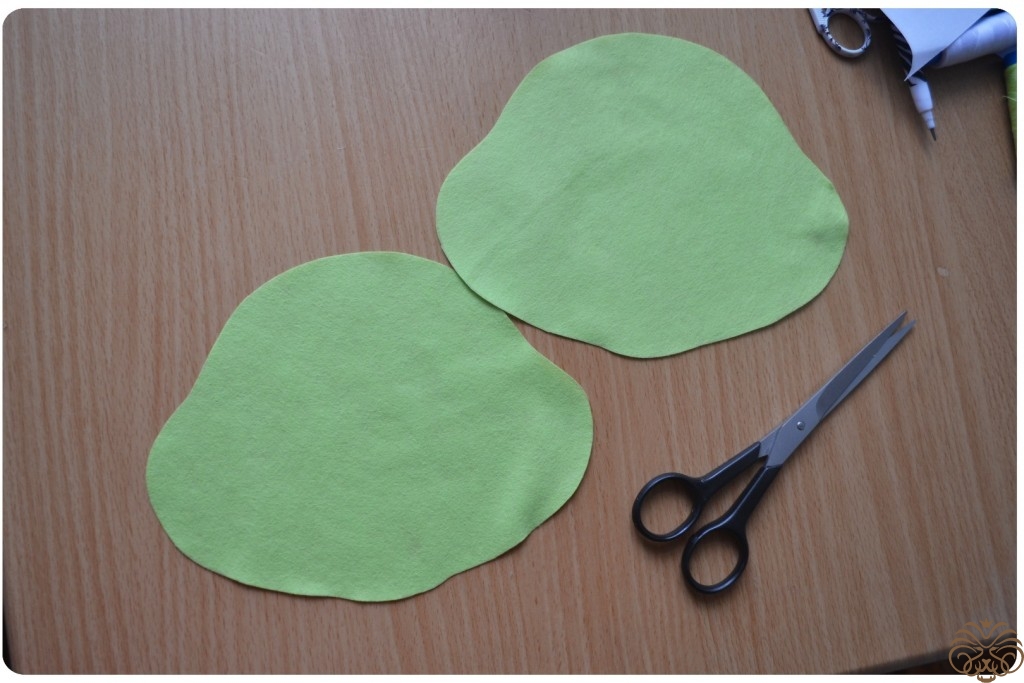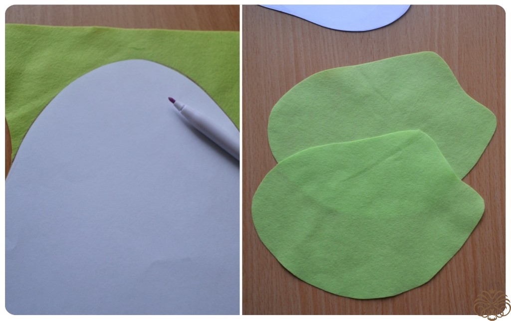 На салатовом фетре самоисчезающим маркером обводим два раза деталь головы ленивца. Вырезаем