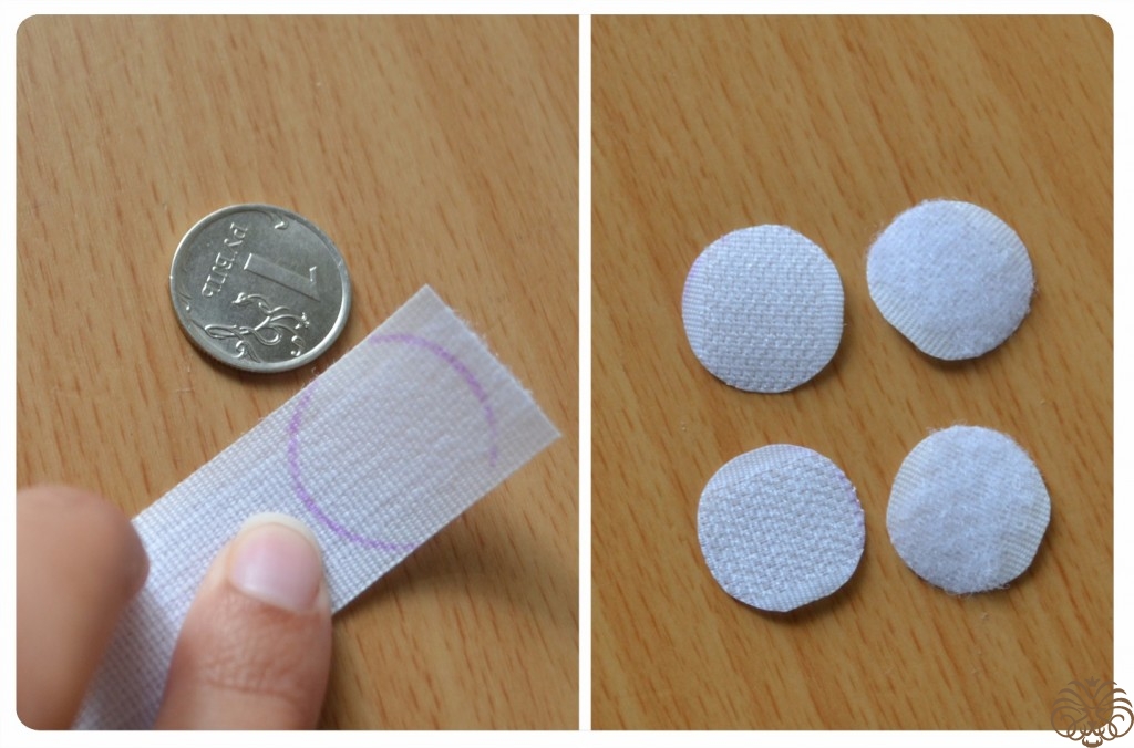 Для того чтобы вырезать ровные липучки закругленной формы, я буду использовать монетку в 1 рубль. Я вообще советую рукодельницам держать при себе на столе монетки разного диаметра. При помощи них очень удобно вырезать кругляшки разного размера.