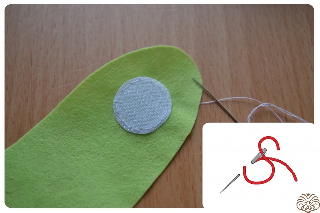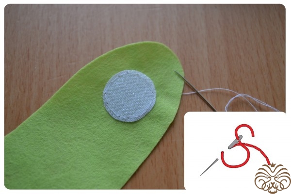 Берем одну вырезанную деталь лапы и прикладываем липучку на верхушку лапы, т.е. на то место, где у живого настоящего ленивца находятся подушечки. Пришиваем липучку белыми нитками швом "назад иголка" как это показано на схеме