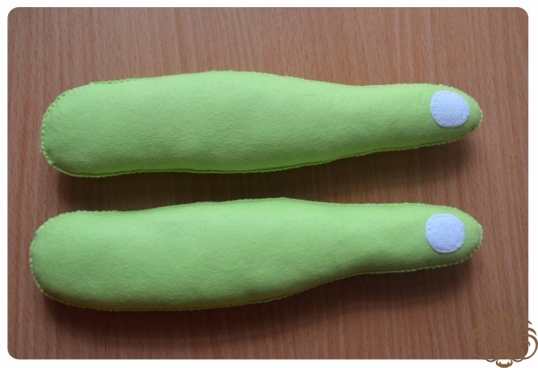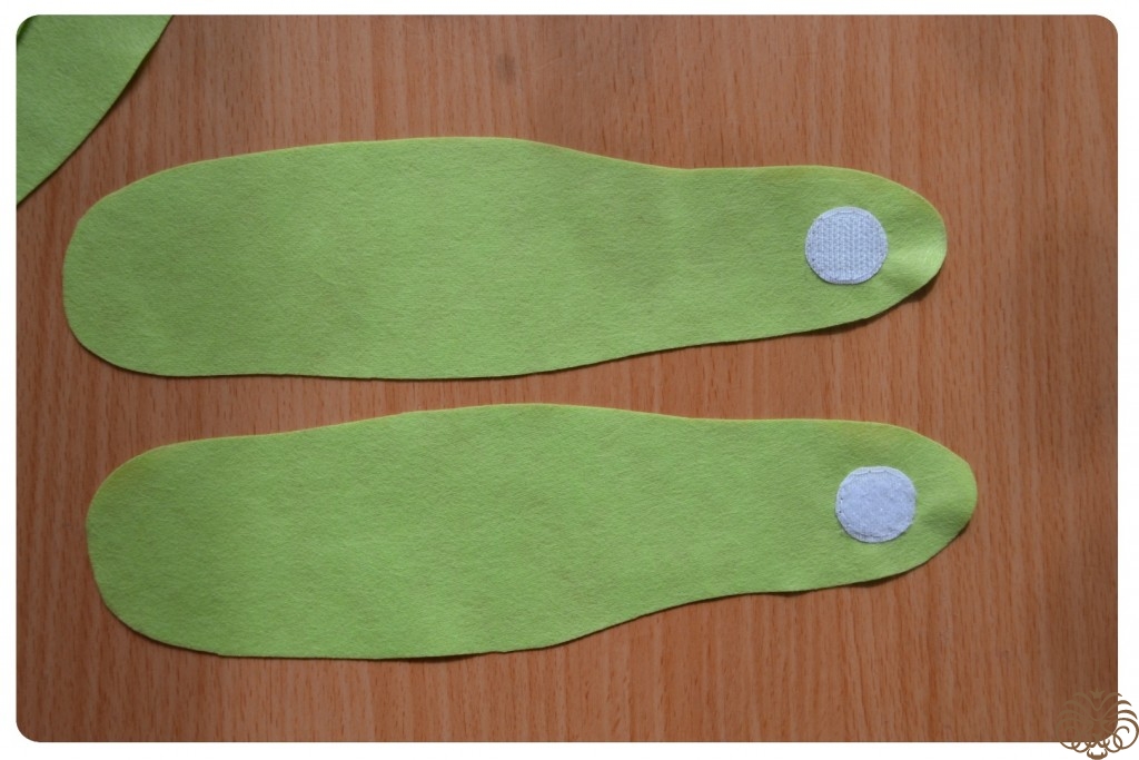 Берем вторую деталь лапы, переворачиваем ее и пришиваем вторую часть липучки. Старайтесь пришить липучки на одном уровне, чтобы потом лапки четко сходились, а липучки скреплялись