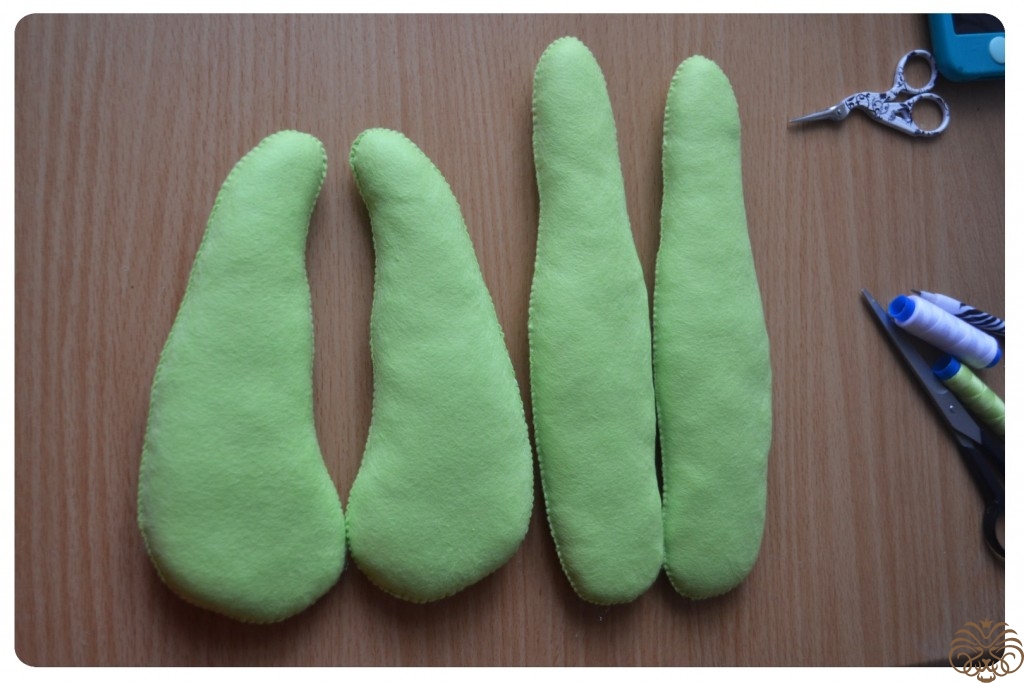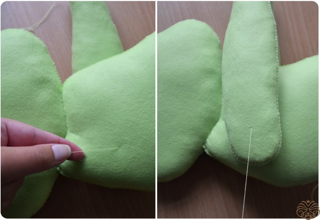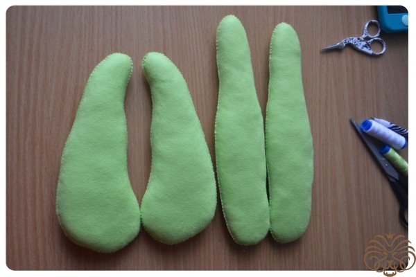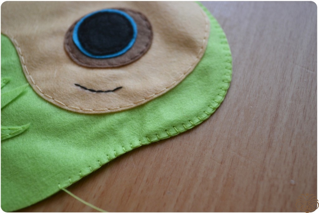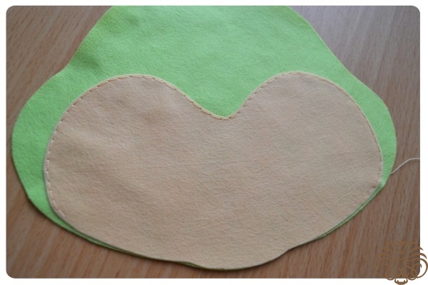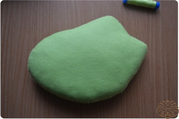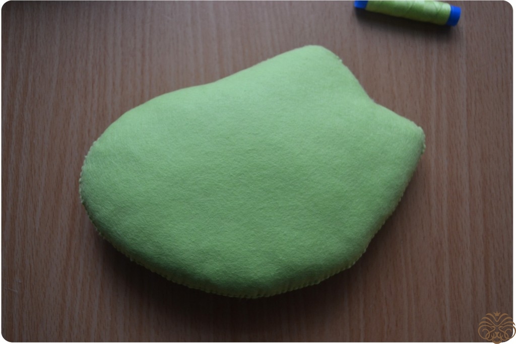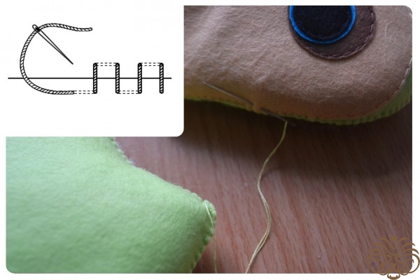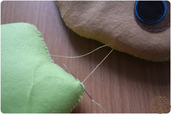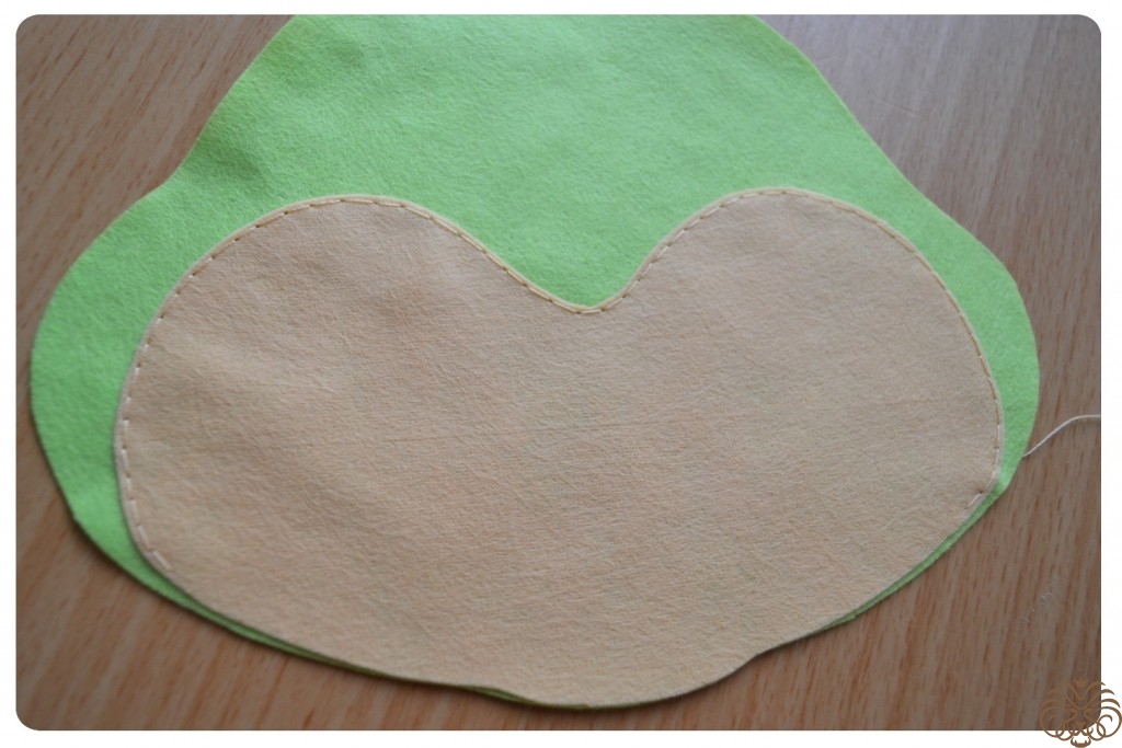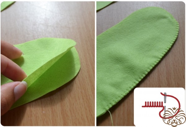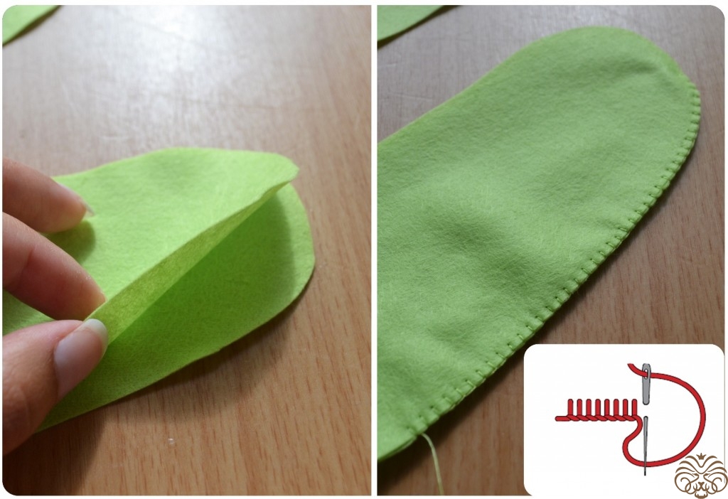 Складываем две детали головы и начинаем сшивать их обметочным швом салатовыми нитками