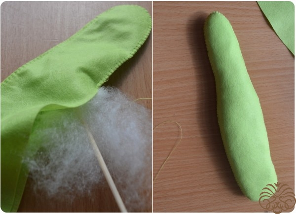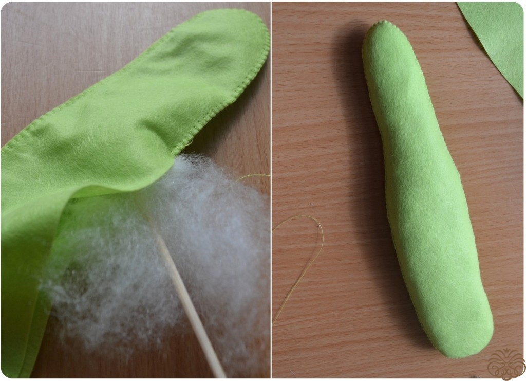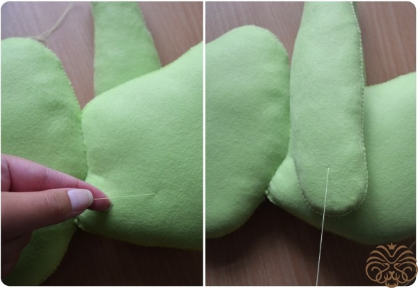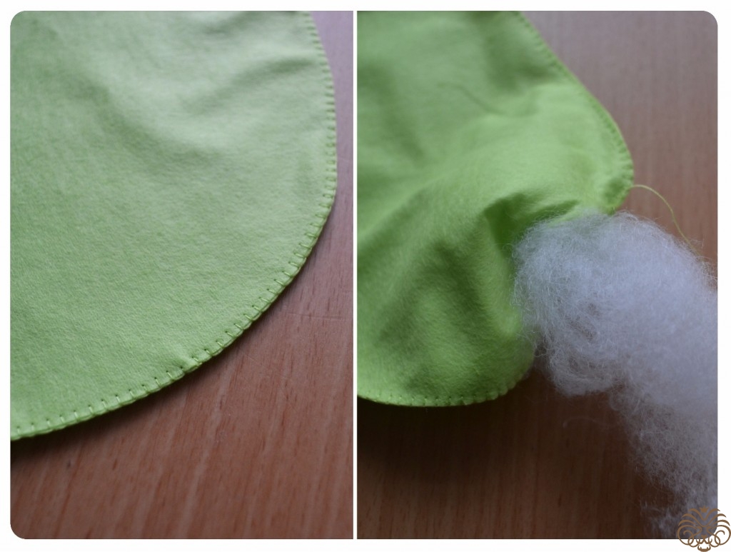 Складываем две детали и начинаем сшивать их обметочным швом. Постепенно набиваем тело синтепоном
