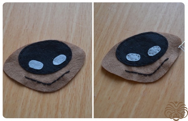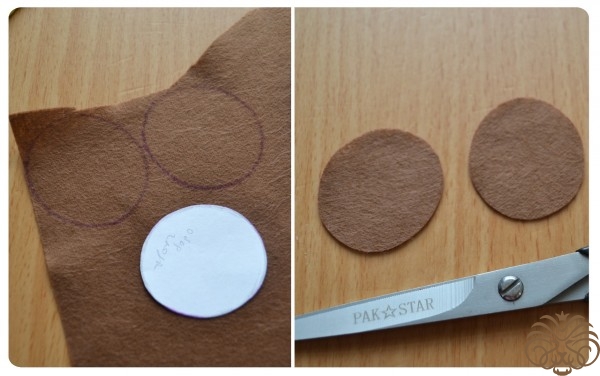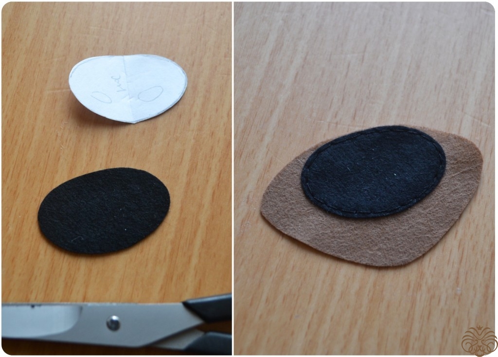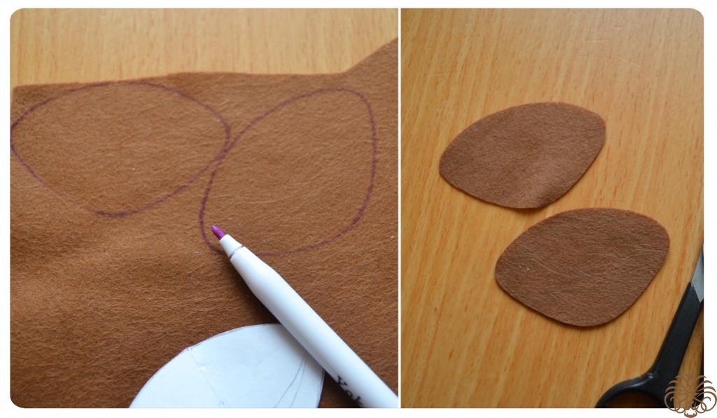 На коричневом фетре самоисчезающим маркером обводим два раза деталь обода глаз ленивца. Вырезаем