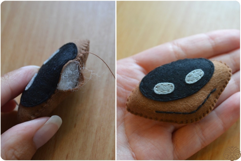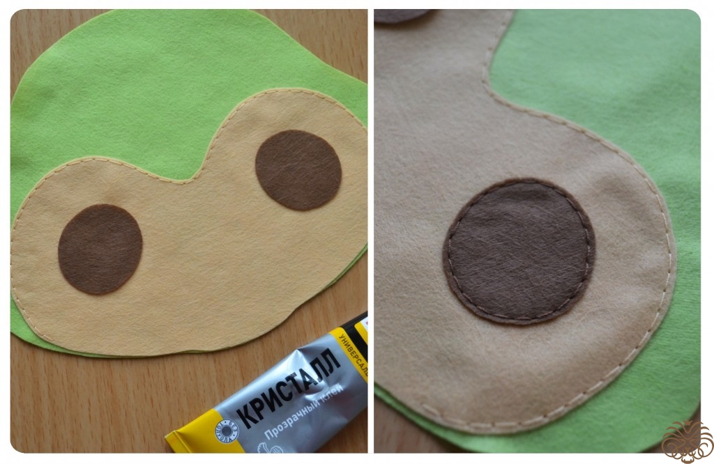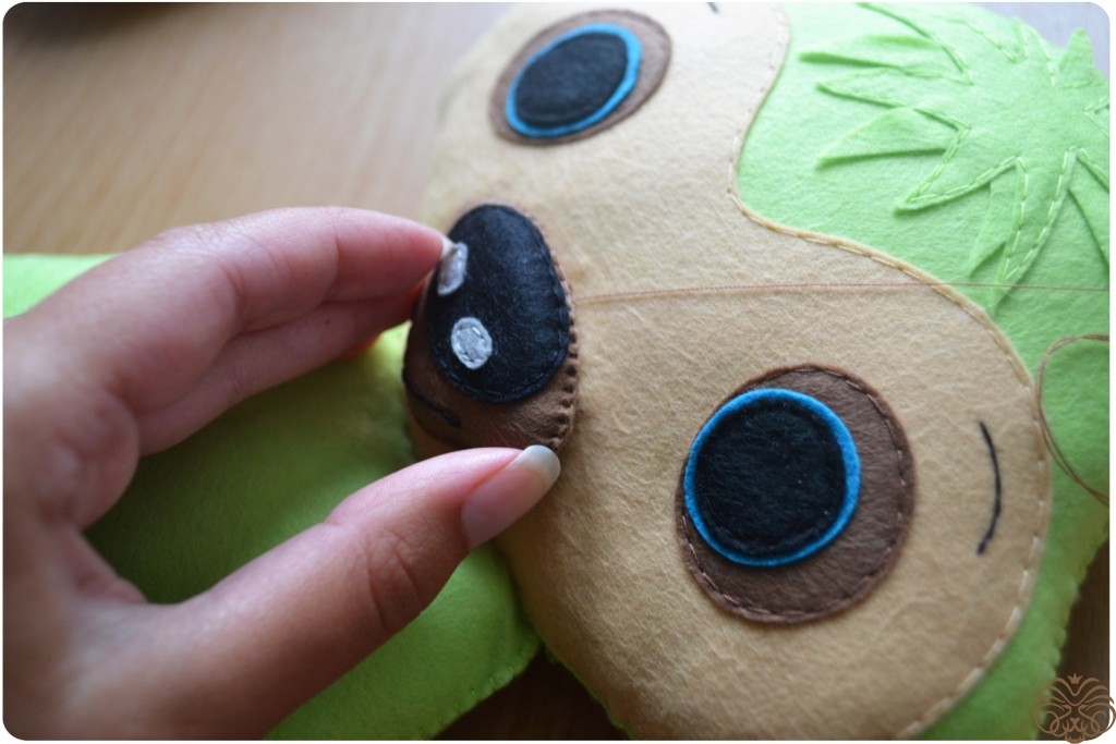 p.s. В данном шаге вы можете поэкспериментировать с цветом волос ленивца. Можно вырезать волосики совсем другого цвета, или сделать нижнюю деталь из фетра более темного цвета, чем верхняя.