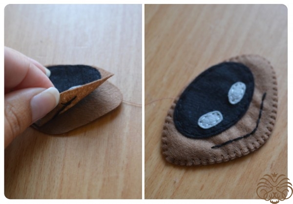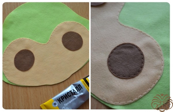Размещаем ободы на личике и пришиваем их коричневыми нитками швом "назад иголка"