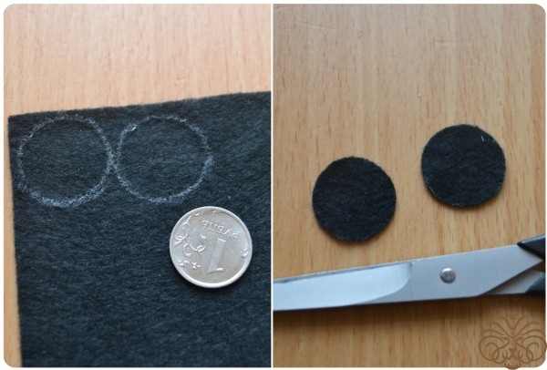 Так как на черном фетре мой сиреневый самоисчезающий маркер практически не виден, я буду использовать для рисования заостренный кусочек мыльца. С помощью него обводим два раза монетку в 1 рубль. Вырезаем. У нас получились зрачки