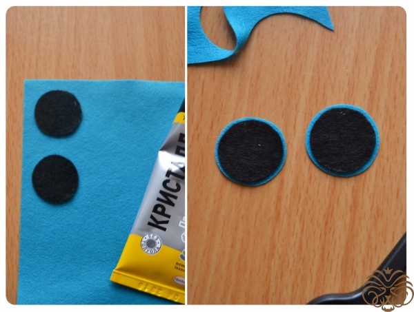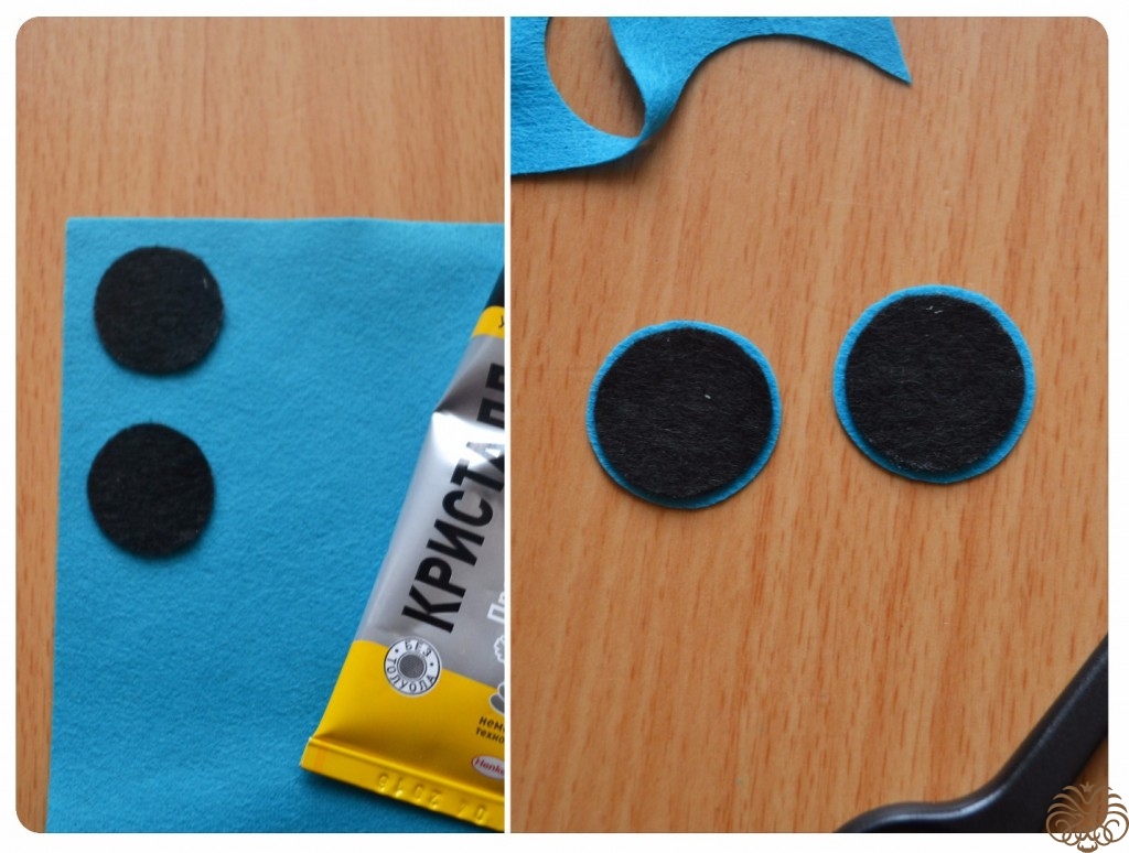 Приклеиваем зрачки на фетре цвета ультрамарин на небольшом расстоянии друг от друга и от краев листа фетра. Теперь вырезаем круги вокруг зрачков, отступая от них где-то 2-3 мм. Теперь у нас есть глаза со зрачками и радужкой