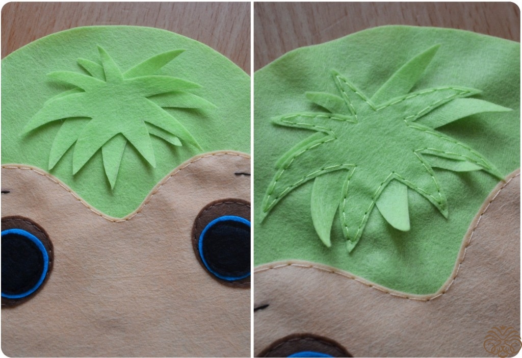 Располагаем волосики на голове ленивца, так чтобы нижняя деталь торчала из-под верхней. Теперь швом "назад иголка" салатовыми нитками пришьем только верхнюю часть, а кончики нижней детали останутся свободно торчать в разные стороны