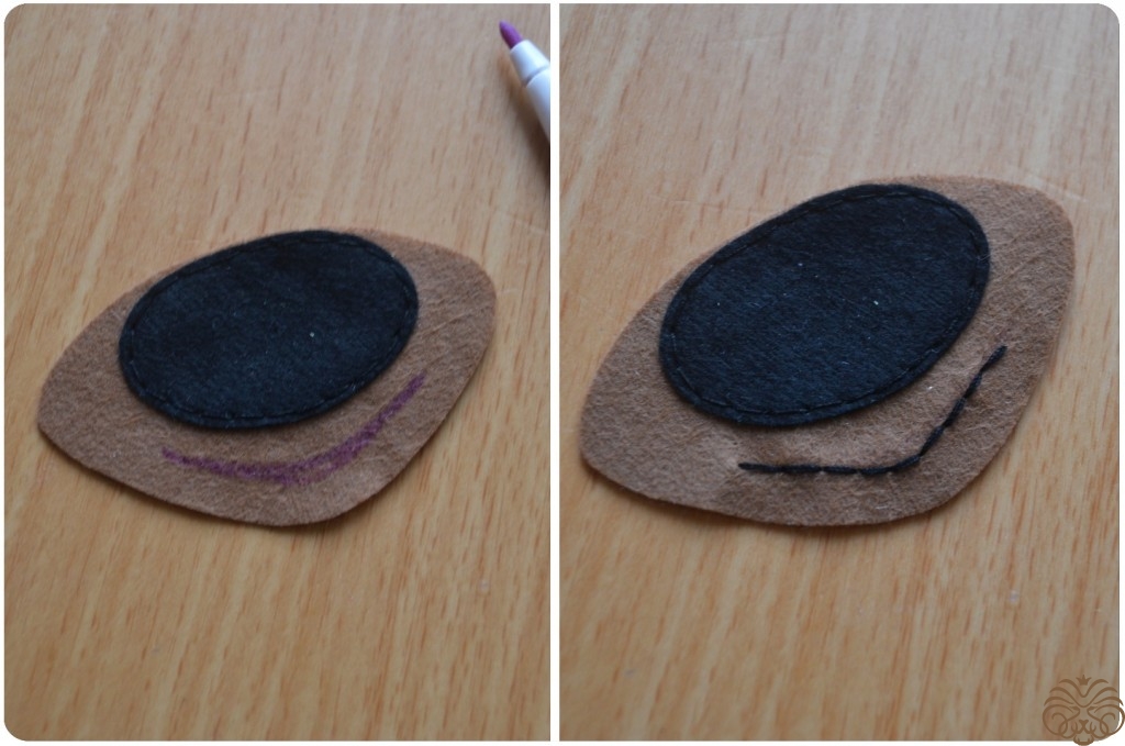 Самоисчезающим маркером нарисуем на мордочке улыбку. Вышиваем её швом "назад иголка" двойными черными нитками
