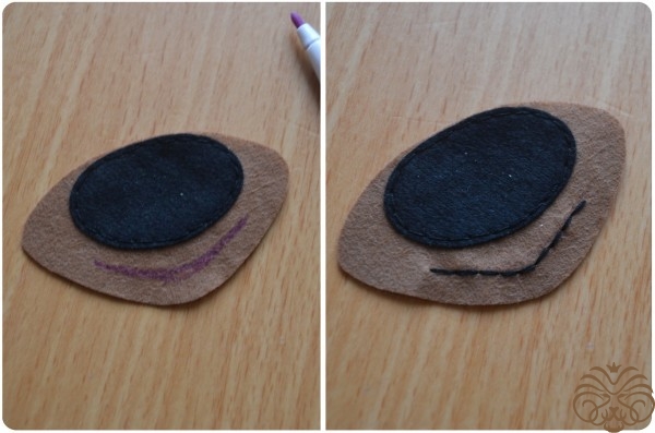 На коричневом фетре самоисчезающим маркером обводим два раза деталь мордочки ленивца. Вырезаем