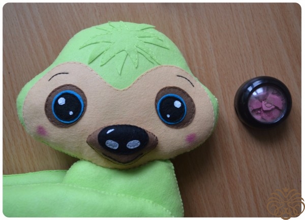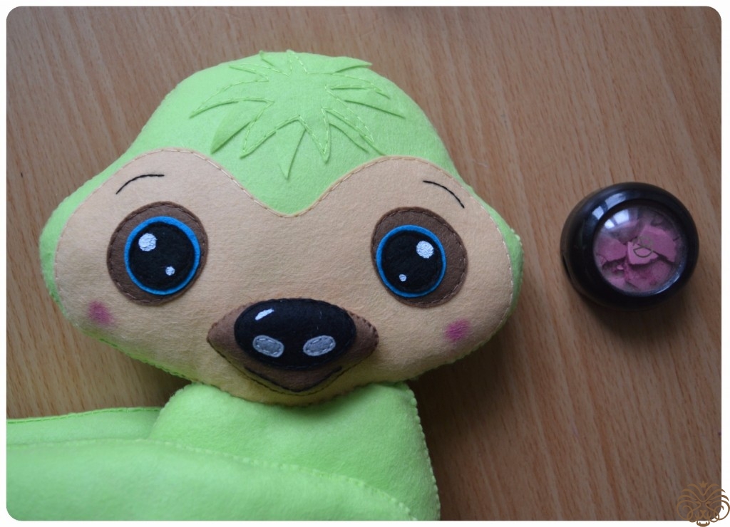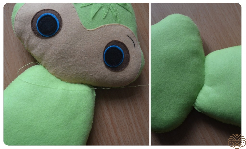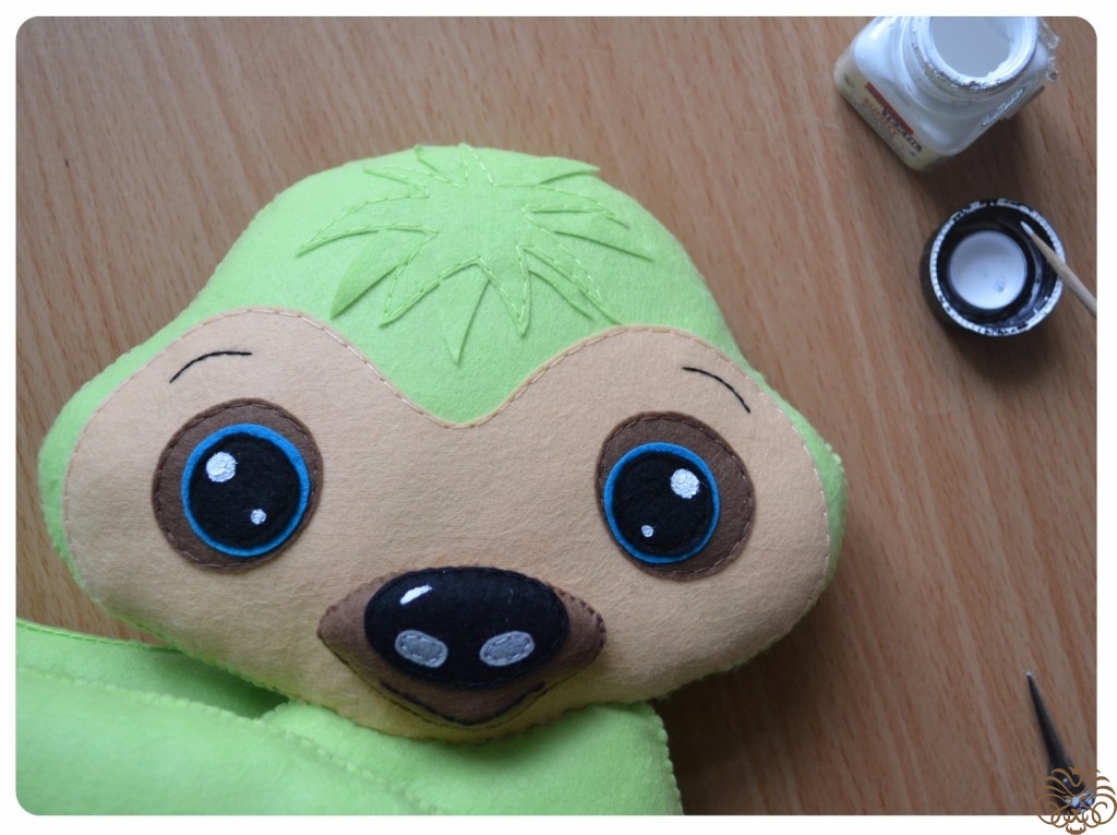 Таким же потайным швом пришиваем коричневыми нитками и мордочку ленивца