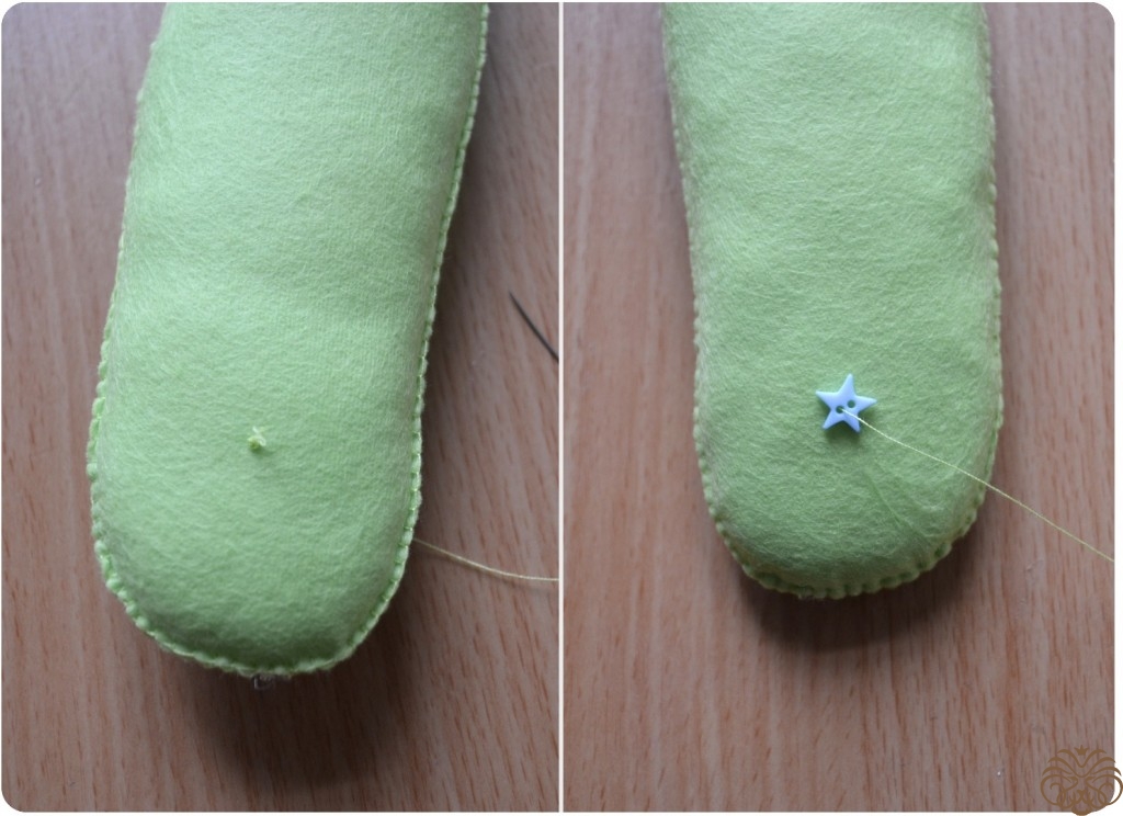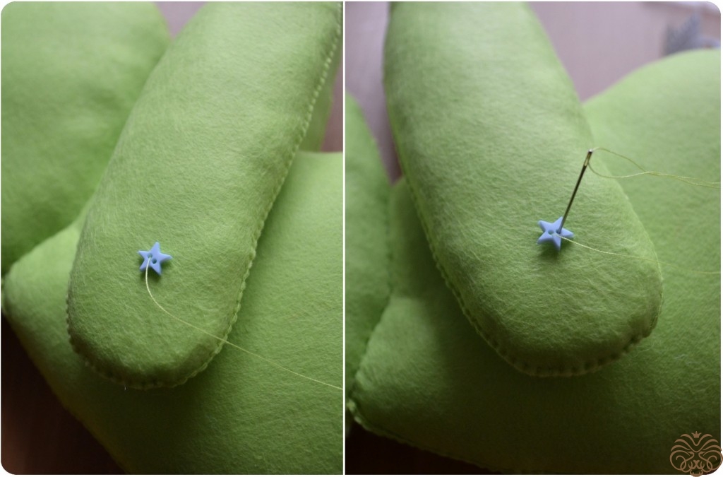 Вдеваем иголку во второе отверстие пуговицы и прикладываем лапу к телу