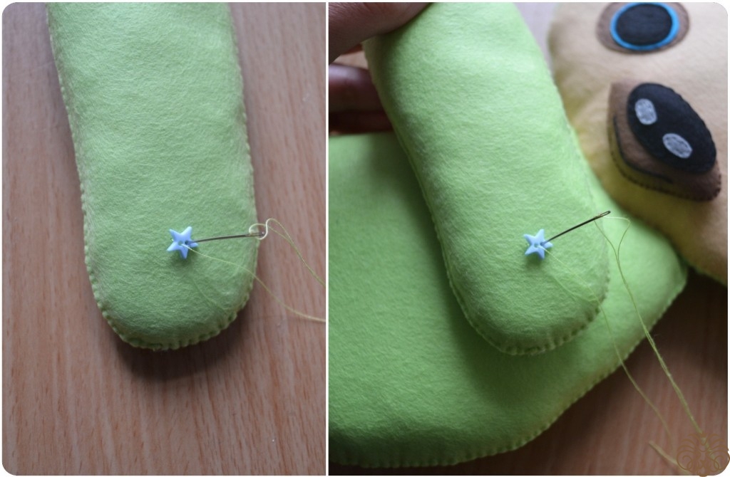 Вводим иголку с салатовой ниткой в край тела ленивца и проводим иголку  сквозь небольшой участок размером примерно 2-3 мм и выводим иголку. Затем вводим иголку уже в край головы ленивца и снова проводим иголку с ниткой через небольшой участок