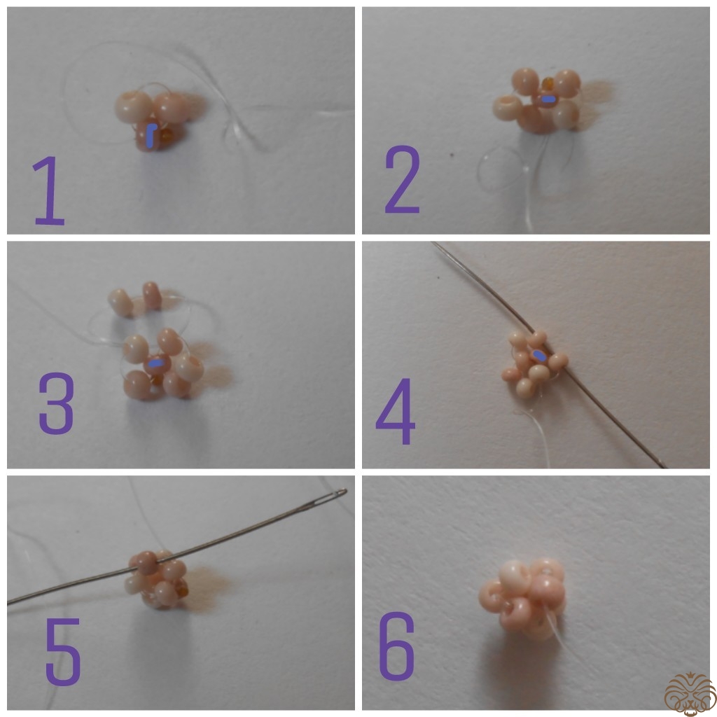 На леску с оплавленным кончиком для фиксации бисерин, нанизываем 3 бисеринки, и входим в первую бисерину на низке, это будет основой для нашего квадратного трёхгранного жгута, вместо 4-х граней. На фото она отмечена фиолетовым цветом.Далее набираем ещё 3 и опять входим, в ту же бисерину, образуя первую "грань" жгута. Основа имеет 3 бисерины, а грань-4, и следующим шагом будет: войти в следующую бисерину в основании, нанизать 2 бисеринки и пройти иглой бисерину грани, и замкнув круг в той же бисеринке в основании, с которой начали, образовав ещё один крестик-"грань". На фото под №4 повторяем предыдущий шаг, но начиная образование крестика из 3-ей бисерины основания,входим в бисерину крестика, нанизываем новую и входим в бисерину другого крестика, образуя 3-ю грань. После, лучше опять пройти те же бисерины: основания, крестика, и новую вплетённую, выходим из последней, продолжая таким образом плести жгут (мой достигает в длину 33 крестика).