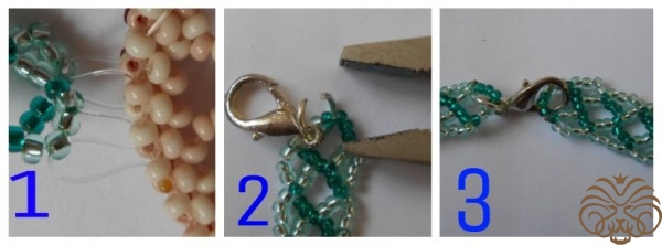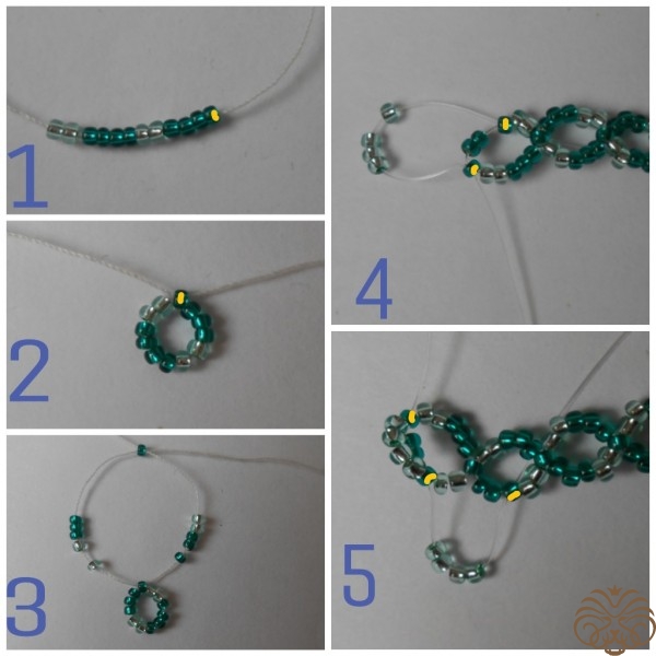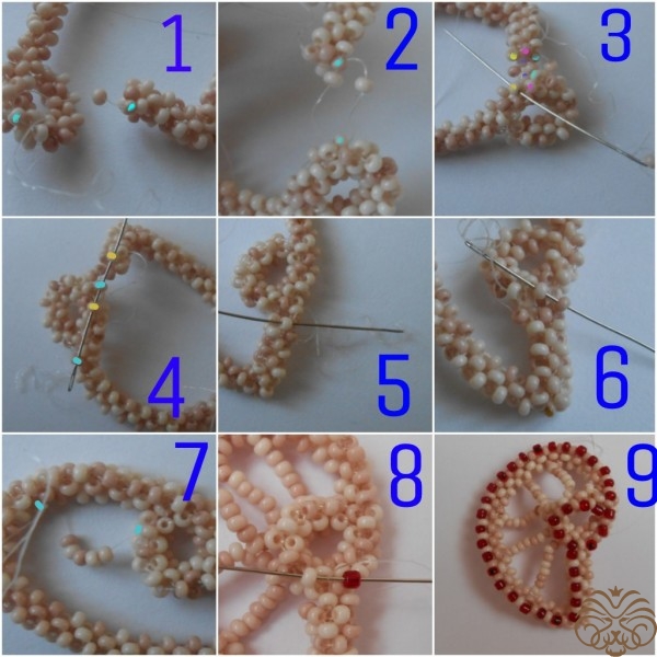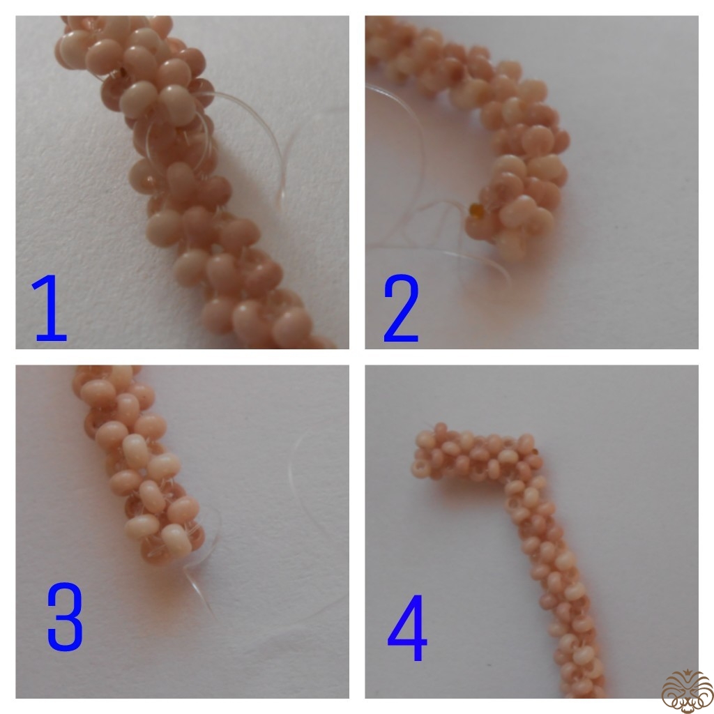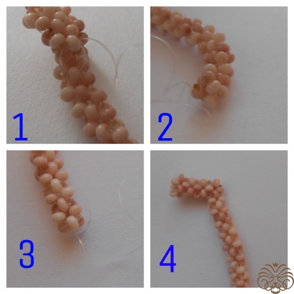Создание серединки раковины: сплетя жгут до нужной длины, оставляем леску, отсчитываем от конца 9 крестиков, и сшиваем их вместе(9-ый и последний), как показано на первом фото, по этому принципу сшиваем все бисерины одного крестика с другим.На втором фото возвращаемся к другому концу жгута, и из одной из граней (крестика) плетём короткий жгут длиною в 3 крестика, но уже четырёхгранный (фото №4).Здесь важно проследить, чтобы кружок на одном конце жгута, и маленький жгутик на другом, располагались н одной грани.