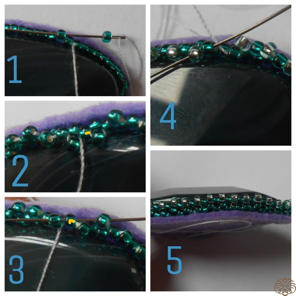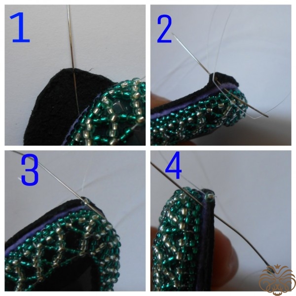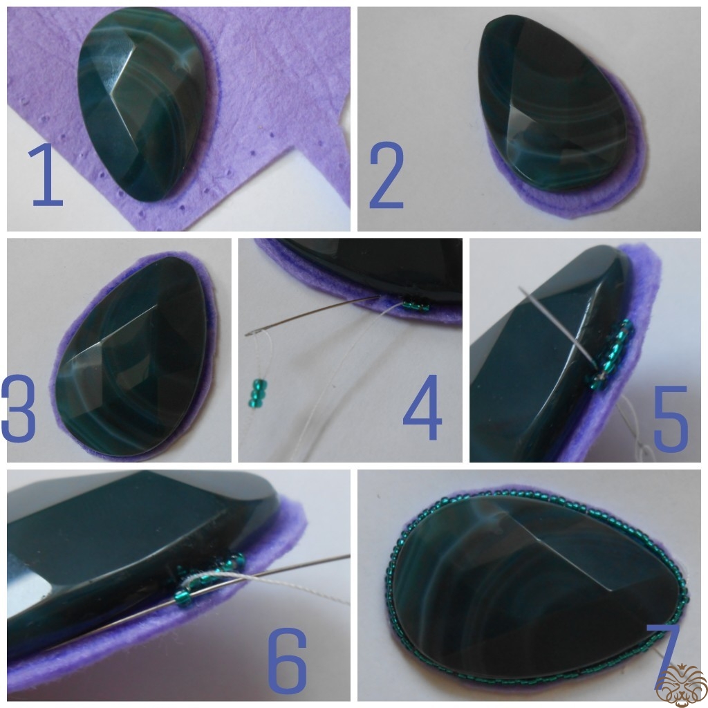 1- прикладываем кабошон к фетру, обводим. 2- отступив 0,5 см от обведённой линии вырезаем кусочек фетра. 3- приклеиваем кабошон к фетру. 4,5,6-обшиваем кабошон бисером арочным швом: закрепив нить с изнаночной стороны фетра, выводим иглу очень близко к краю кабошона нанизываем 3 бисерины, проходим иглой на изнаночную сторону и выводим на лицевую перед третьей бисериной на низке,проходя через неё нитью
