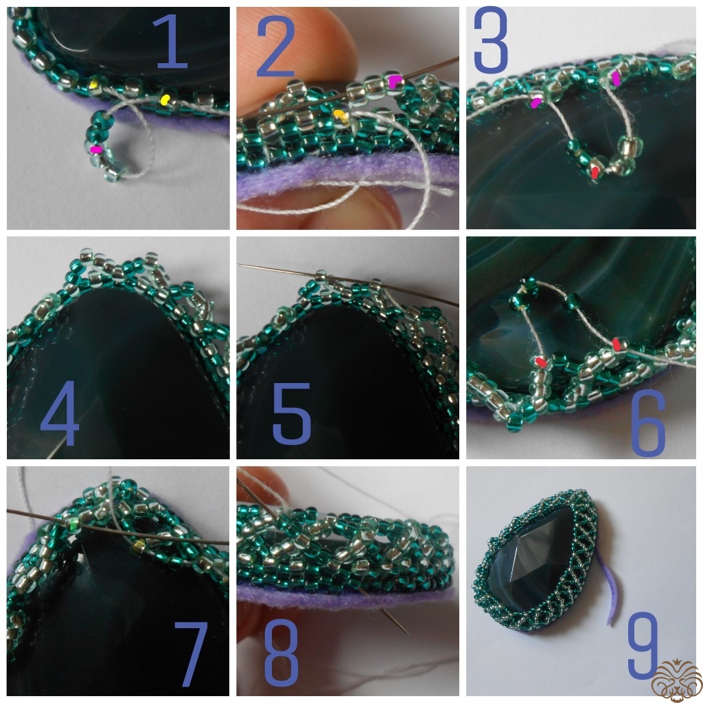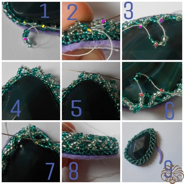 Создаём цепочку, обрамляющую кабошон. Работаем с последним мозаичным рядом: выходим из его бисерины и набираем 2 тёмных, 3 светлых бисеринки, пропуская одну бисерину, входим в следующую, образуя ячейку.Продолжаем плетение вдоль всего кабошона. Вернувшись к первой ячейке проходим через её светлые бисерины, выйдя на новый ряд, и продолжая предыдущие действия. Фото №4,5,7 для кабошонов каплевидной формы. Под заострённой частью кабошона должны получиться 2 ячейки, как на фото, между ними не вплетаем бисерин, а просто проходим через верхние бисерины ячеек. Выполняем третий- заключительный ряд цепочки в котором нам понадобятся только тёмные бисерины. Выйдя из верхней бисерины предыдущего ряда, набираем 3 тёмные бисерины, и проходим через следующую ячейку, т.о. затягивая нашу цепочку. Совет: чтобы избежатьнеровностей и стяжек, лучше использовать нить а не леску, на данном этапе. Фото №8 выходим иглой на изнанку,закрепляем нить и обрезаем. 9 фото- обрезаем ненужный фетр по краям.