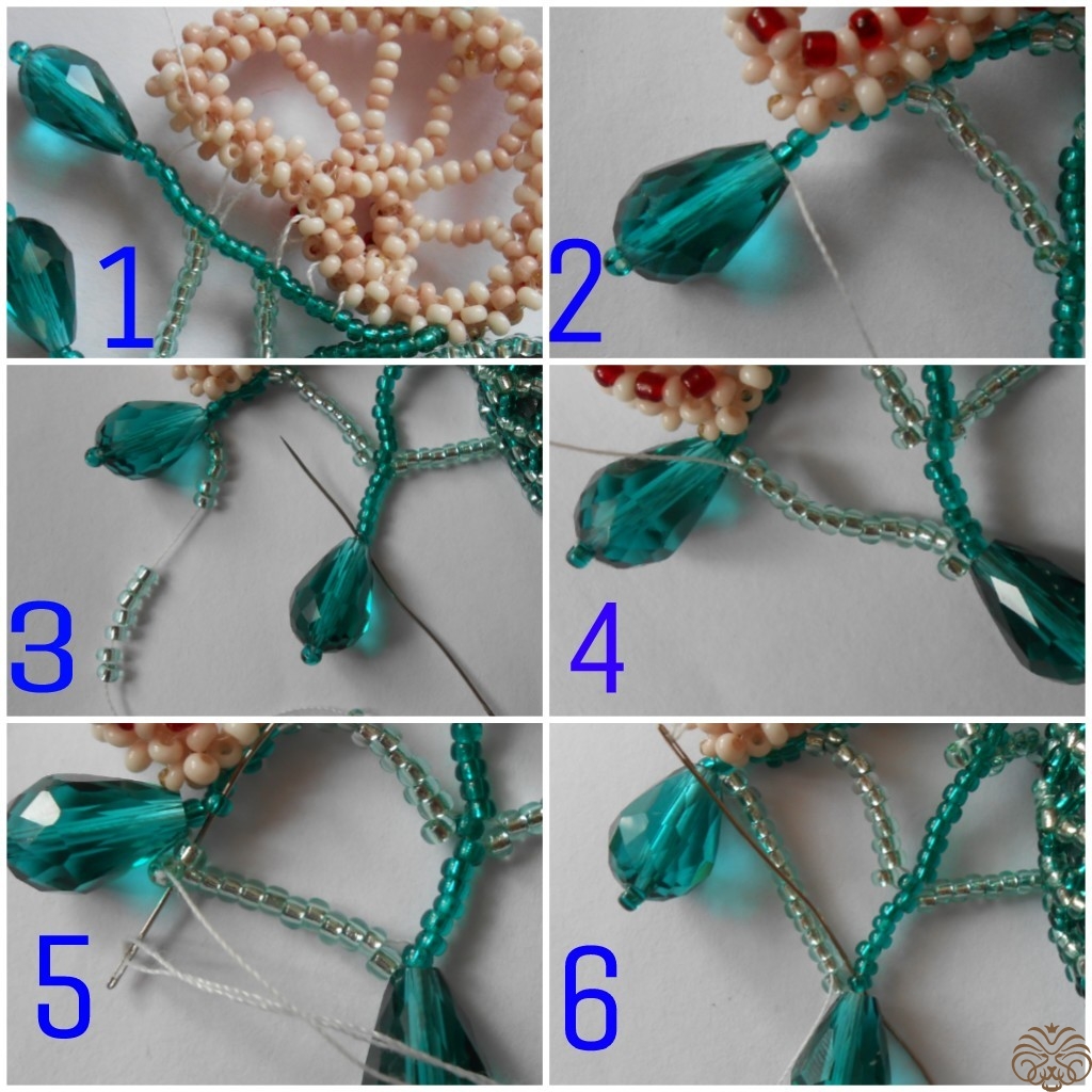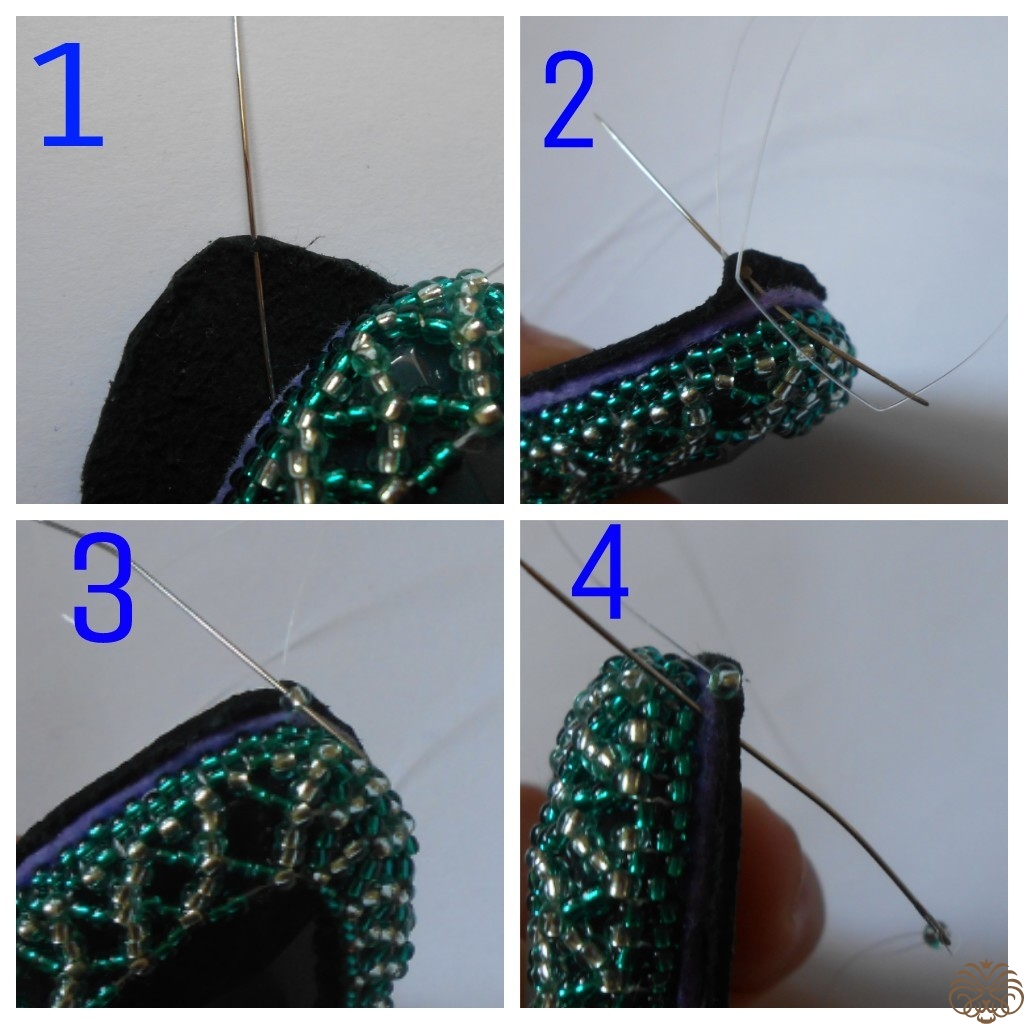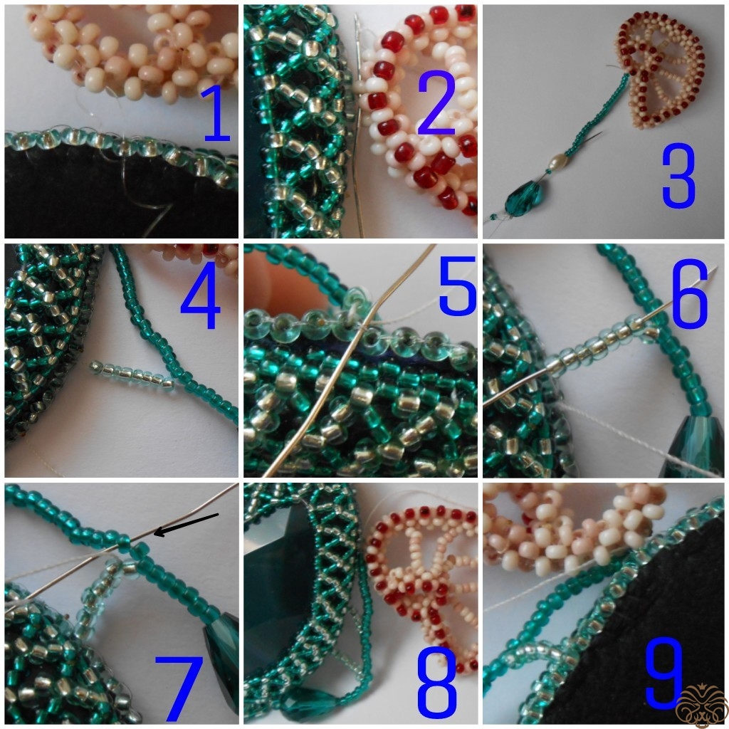 1-присоединяем ракушку как показано на картинке, для надёжности пройдя бисерины несколько раз. 2- выходим из бисерины в ракушке нанизываем тёмный бисер до нужной длины и бусину-каплю - назовём эту низку бисера:основание для "перепонок". Пройдя с конца бисерин 10 (примерное фото №3) делаем "перепонку"- фото 4. Входим иглой в бисерину обшивки, проходим их в другом направлении кроме последней- фото №6. Фото №7 стрелочкой показано направление прохода иглы, после этого проходим ещё 10 бисерин и делаем ещё одну "перепоночку". После этого пронизываем наше основаниедля "перепонок"до самого конца, к месту присоединения кабошона к ракушке. Фото 9- проходим в следующую бисерину ракушки для второй низки, которая должна быть меньше предыдущей.