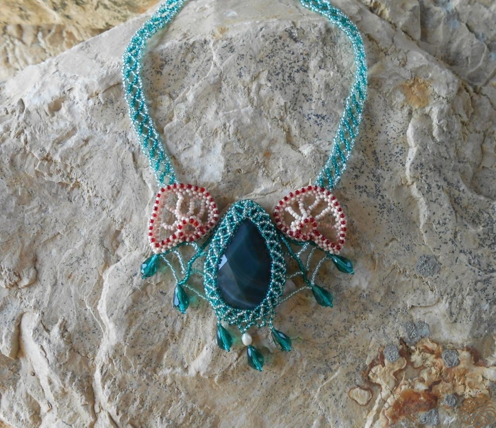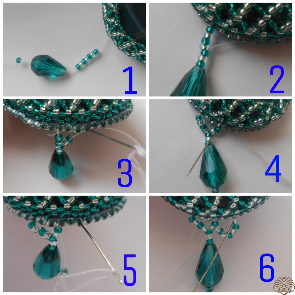 Украшаем нижнюю часть кабошона бисерной бахромой (используем нить). Выходим из бисерины,обшивающей край кабошона, и набираем 7 бисерин-бусину каплю- 1бисерину (здесь вы можете выбрать другое кол-во бисерин, но после капли должна следовать только одна бисеринка). Проходим иглой через бусину и 3 бисерины, нанизываем ещё 2. Отсчитаем 3 бисерины, от той из которой вышли, входим в 3-ю. С обратной стороны, пропуская пронизаную бисерину в обшивке, входим в бисерину (фото№4) и набираем ещё 7, получится ячейка. Пропуская 1 бисерину, входим во вторую. Выполняем действие показанное на фото № 6, делаем середнюю подвеску, по тому же принципу что и первую(перед ячейкой), но она должна быть длиннее. В средней, я использовала речную жемчужину, чтобы удлинить подвеску.Получается в бахроме 3 подвески(1 в середине, 2 по краям), а между ними 2 ячейки. Сделав среднюю подвеску, повторяем те же самые методы плетения, но сначала сделав ячейку, а потом крайнюю подвеску.