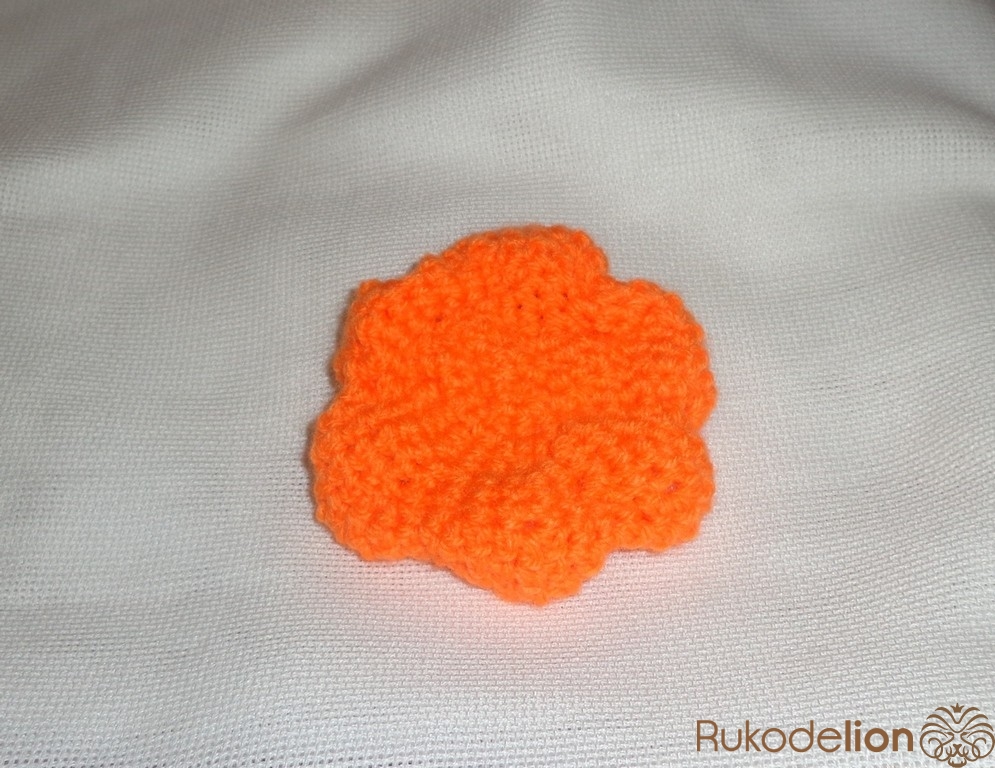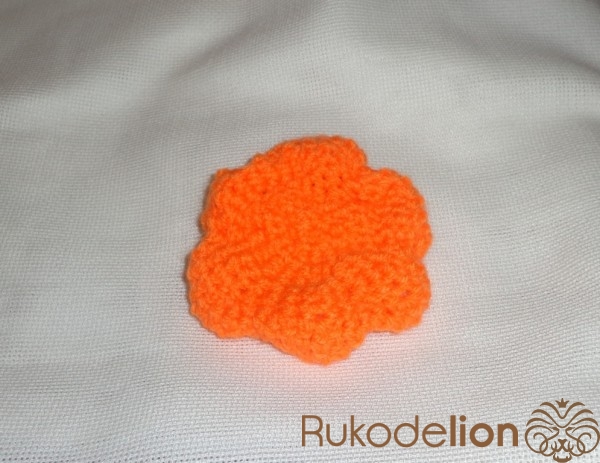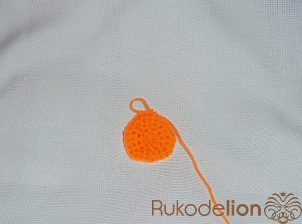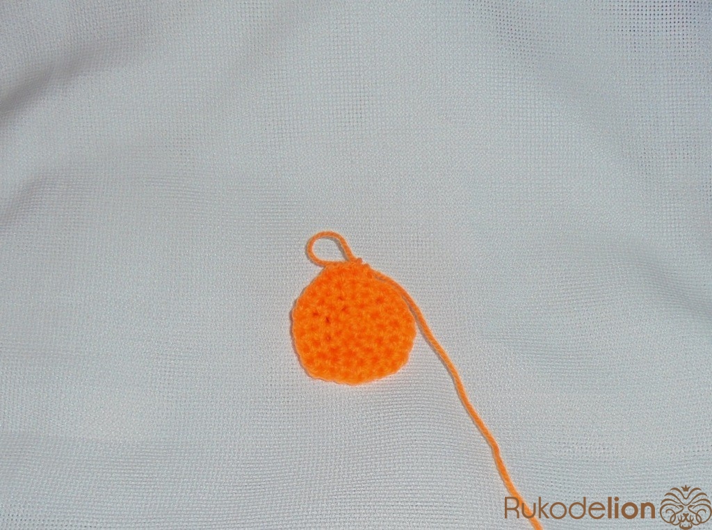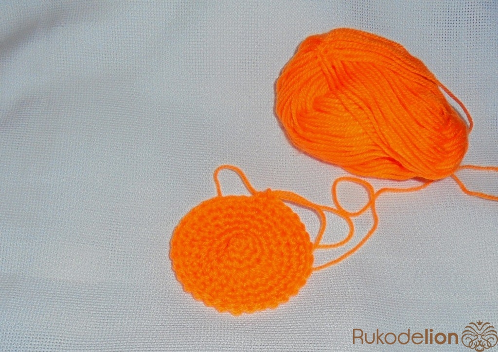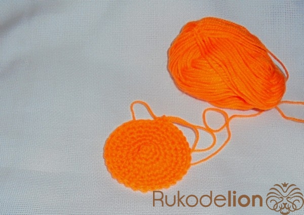 Тыковка будет состоять из нижней и верхней части. Для вязания тыквы берем оранжевый акрил. Набрать 3 воздушные петли и соединить в кольцо. Обвязать с увеличением петель в 2 раза (1 ряд). Во 2 и 3 ряду прибавить через 1 петельку.