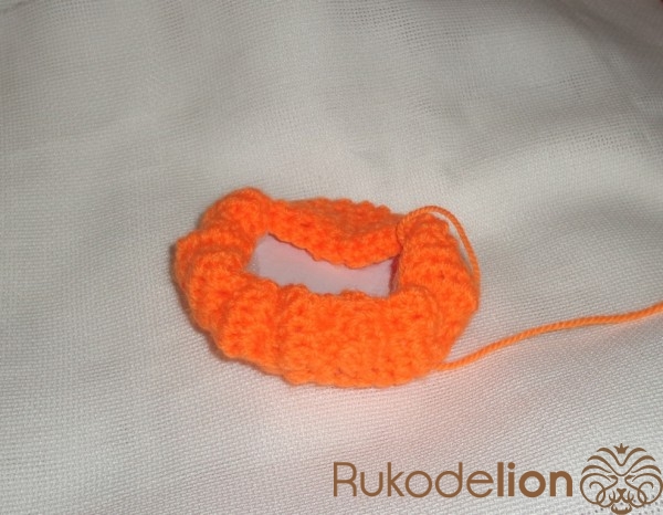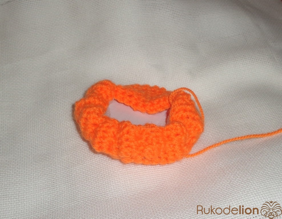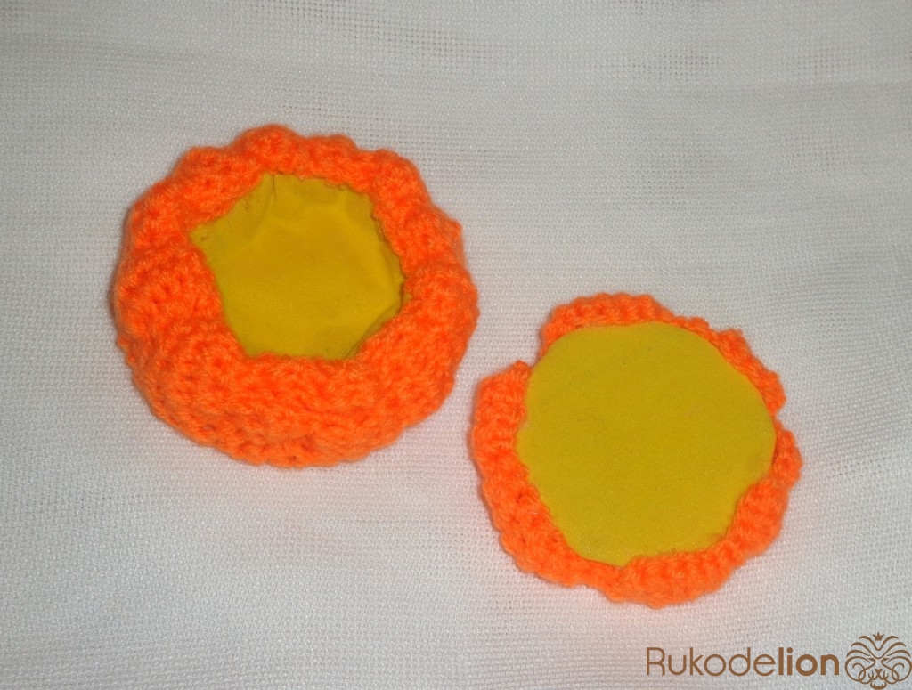 4 ряд просто обвязать. В 5 ряду прибавить через каждые 2 петли. И с 6-16 ряд обвязать по кругу. Вырезать из картона круг под размер дна шкатулки. Приклеить картон и начинает затягивать края тыквы. Для этого проденьте в иглу с большим ушком оранжевую нитку. Продеть иглу по стороне тыкву и затянуть, потом через 3-4 петли продеть иглу и затянуть и так далее.