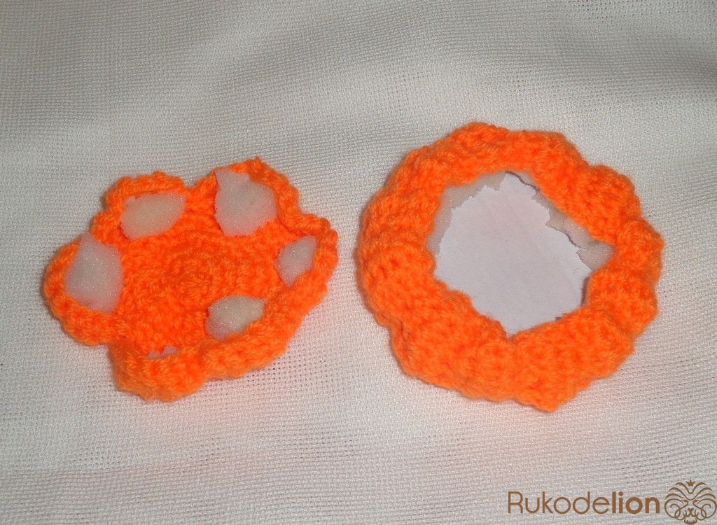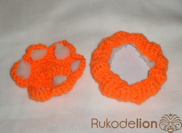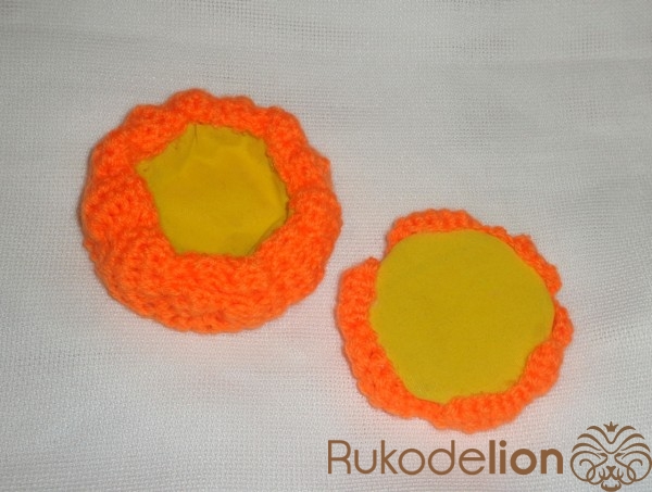 Картон обклеить желтой тканью и приклеить к вязаным заготовкам.