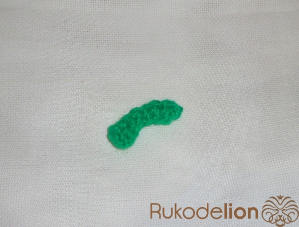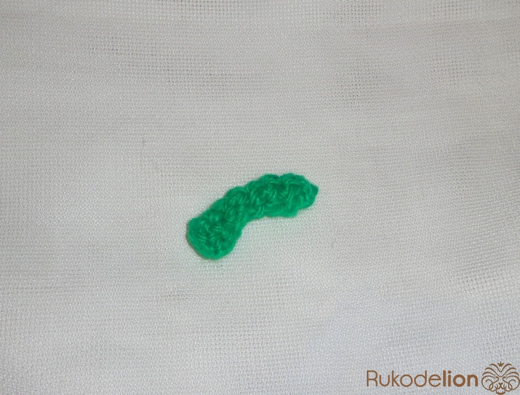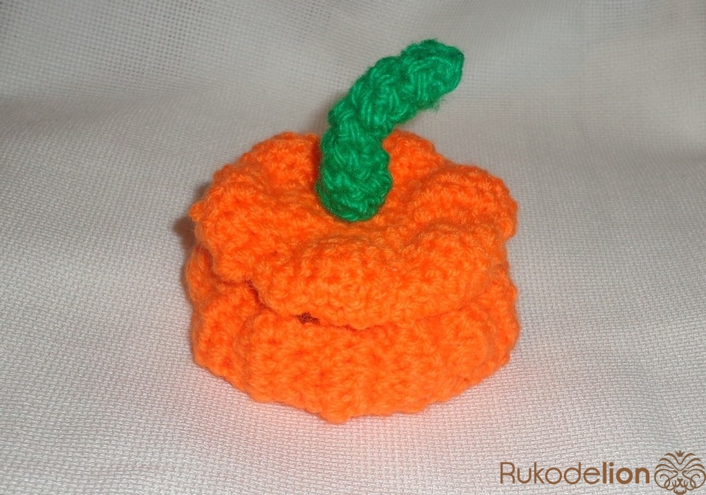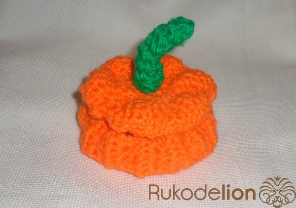 Хвостик для тыквы вяжется из зеленой пряжи. Набрать 3 петли и соединить в кольцо. Прибавить в каждой петле, затем провязать по кругу и положить кусочек поролона. Обвязать еще раз, сократить на одну петлю и провязать 3 ряда по кругу. Сократить все петли и отрезать нить.