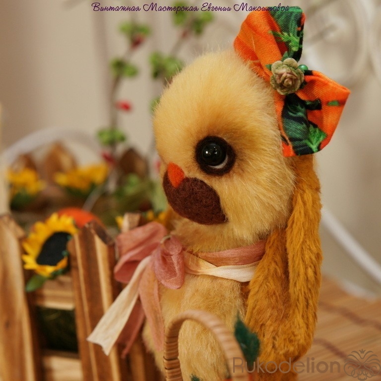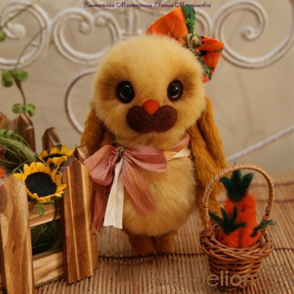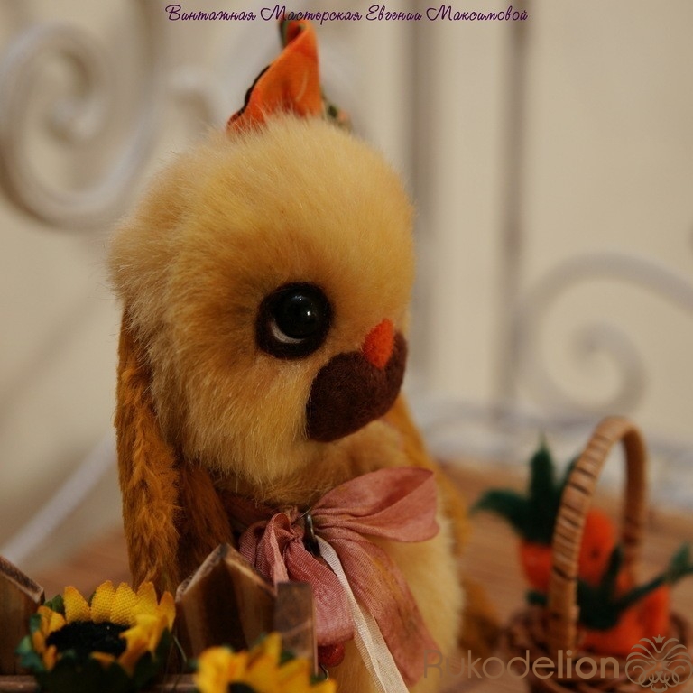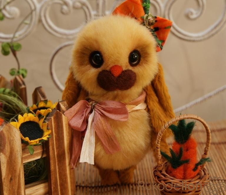 Морковка сшита из немецкой вискозы и искуственного меха . Глазки стеклянные, шплинтовое соединение, набита холлофайбером, тонированная художественными масляными красками.