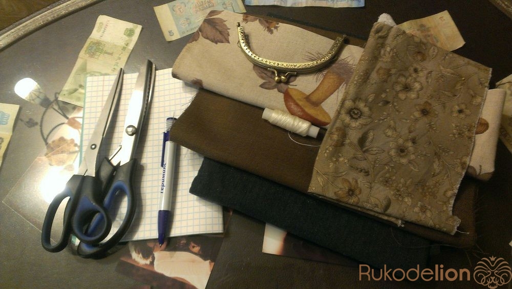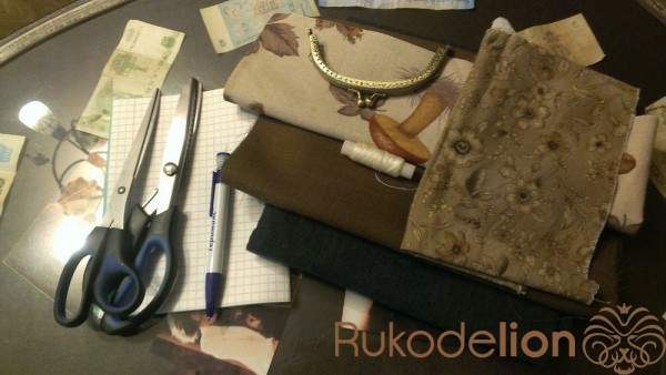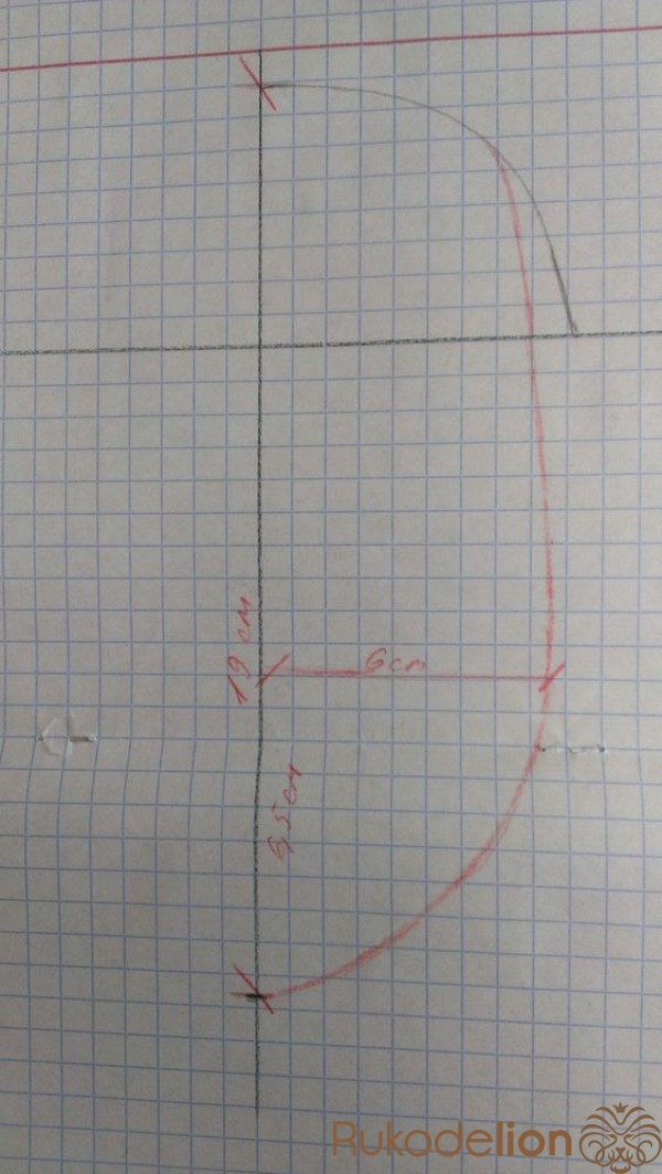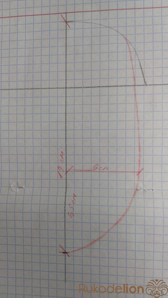 Строим 1/4 часть выкройки, рисуем форму желудя, линию провожу примерно от начала изгиба металлической части фермуара (красная линия), длину будущего кошелька рисуете, как вам больше нравится, у меня 19 см.