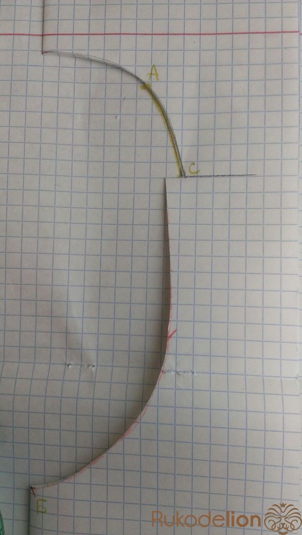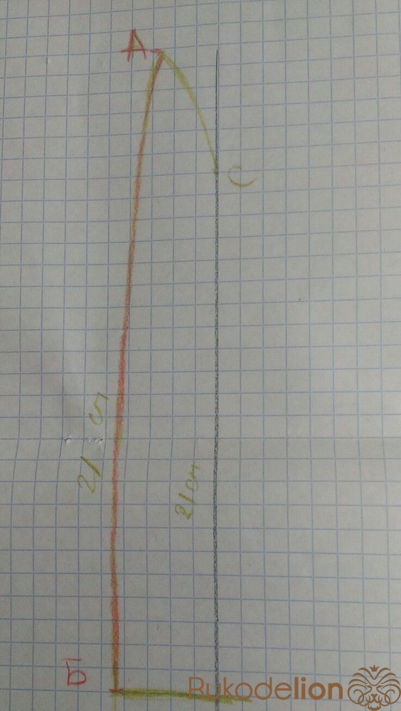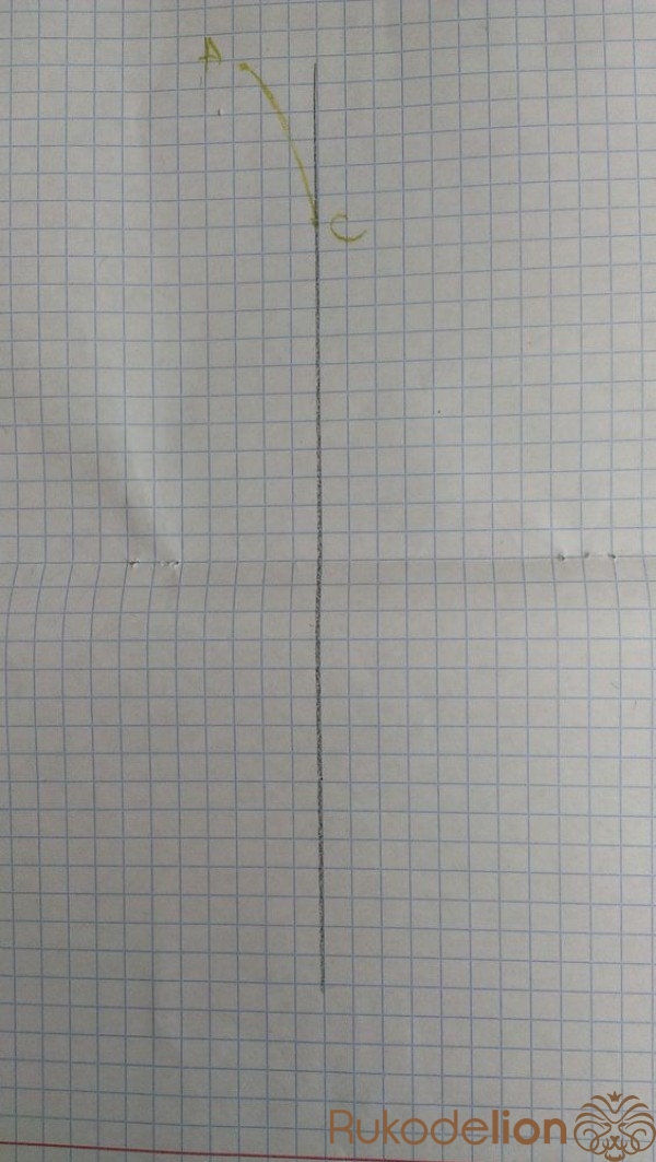Теперь построим боковую часть, рисуем на листе бумаги вертикальную линию, на ней отмечаем линию АС, чтобы сделать это точно, используем предыдущую часть выкройки, прикладываем и чертим.
