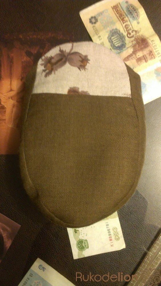 Пришьем фермуар. Пришиваем сначала одну половинку, потом другую. Находим середину в половине кошелька и в фермуаре и начинаем пришивать капроновыми нитками от середины к краю, затем возвращаемся назад, прошиваем до другого конца и опять возвращаемся на середину, получается, что мы прошили сторону дважды. Также пришиваем другую сторону. Готово.