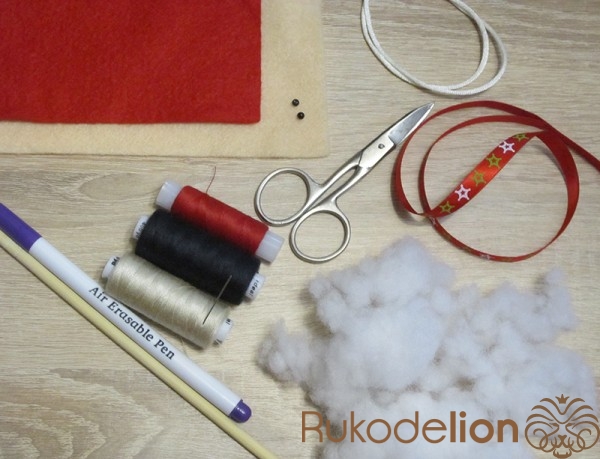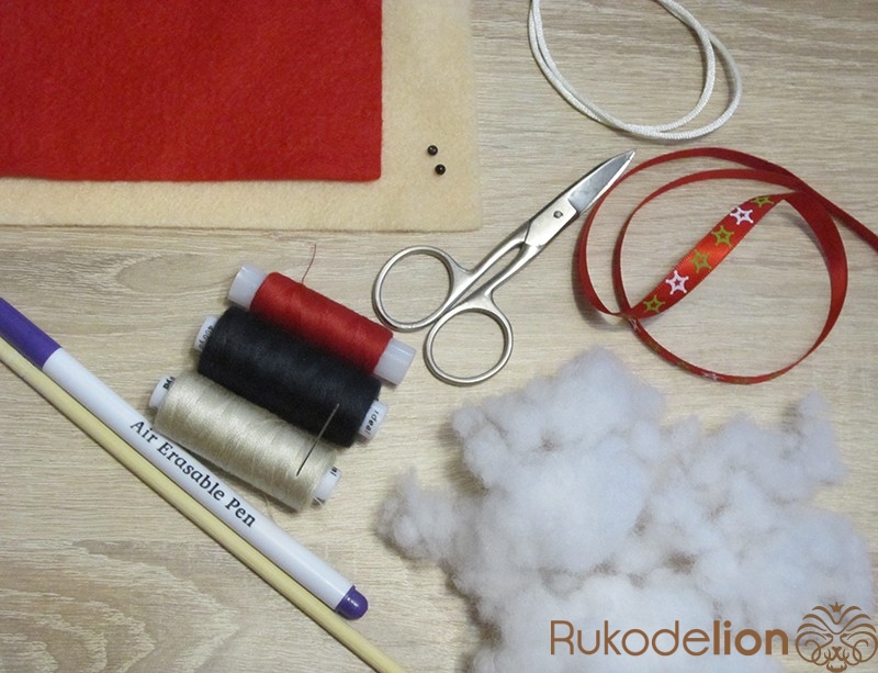 Нам потребуется: фетр двух цветов (в моем случае - бежевый и красный), декоративный шнурок, атласная лента для петельки, 2 бусинки для глаз, нитки в цвет фетра, игла, ножницы, исчезающий маркер, наполнитель (я использовала холлофайбер) и выкройка.