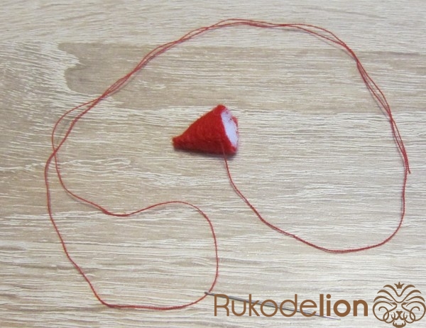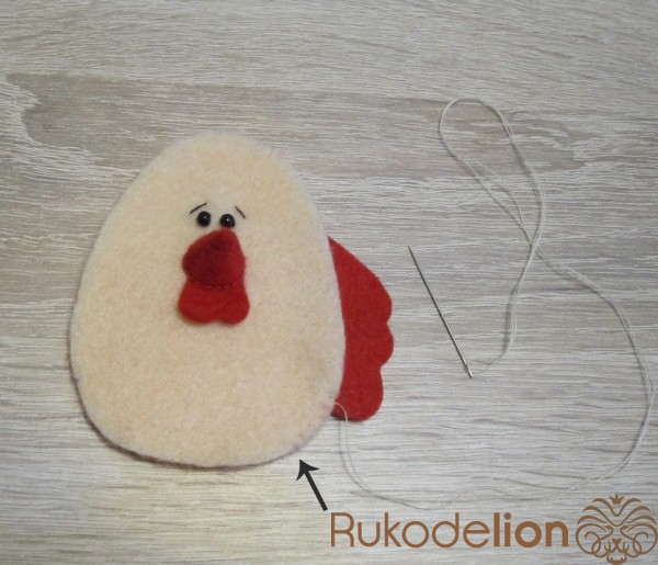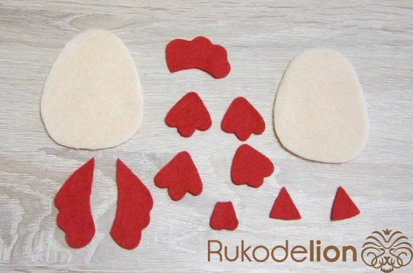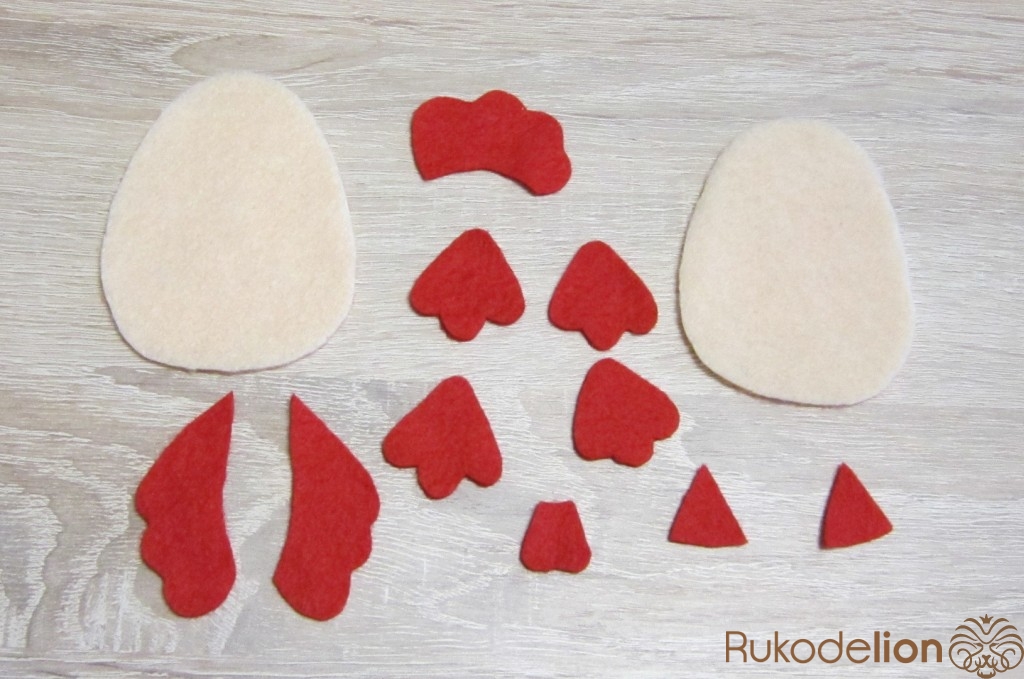 - из красного фетра: крылья - 2 детали, гребешок - 1 деталь, клюв - 2 детали, сережки - 1 деталь, лапы - 4 детали.
