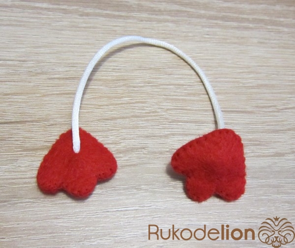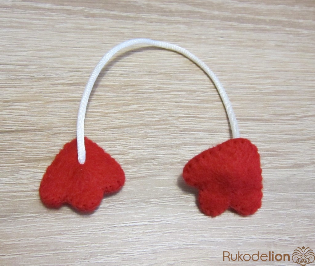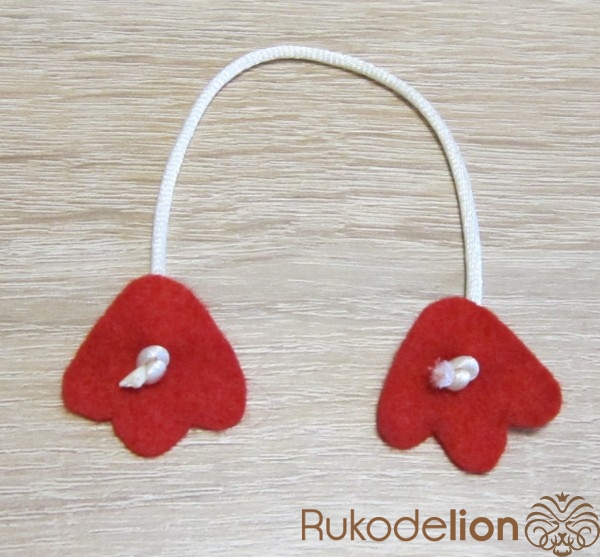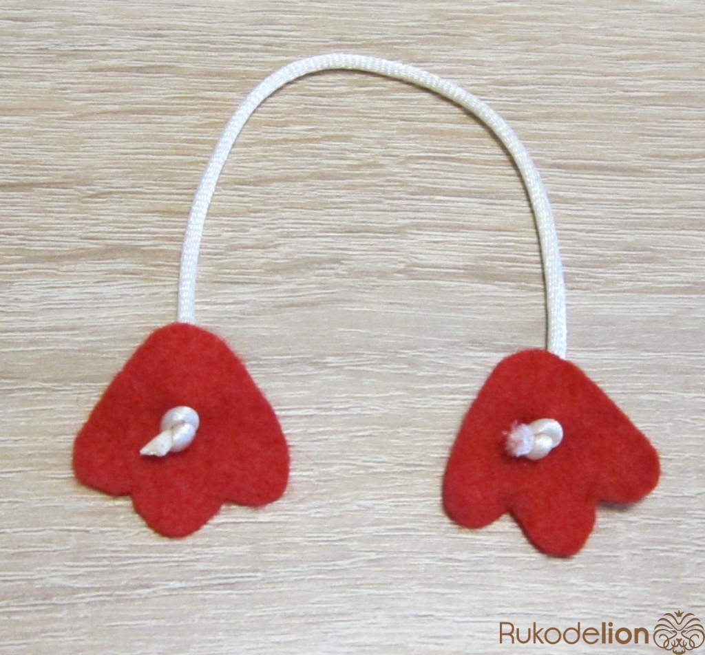 Шьем лапки. Отрезаем 20 см от декоративного шнурка. На двух верхних деталях лапок делаем маленькие отверстия в месте, указанном на выкройке. В отверстия вставляем концы шнурка и завязываем небольшие узелки. Важно не делать очень большие отверстия, чтобы узелки в дальнейшем не выпадали.