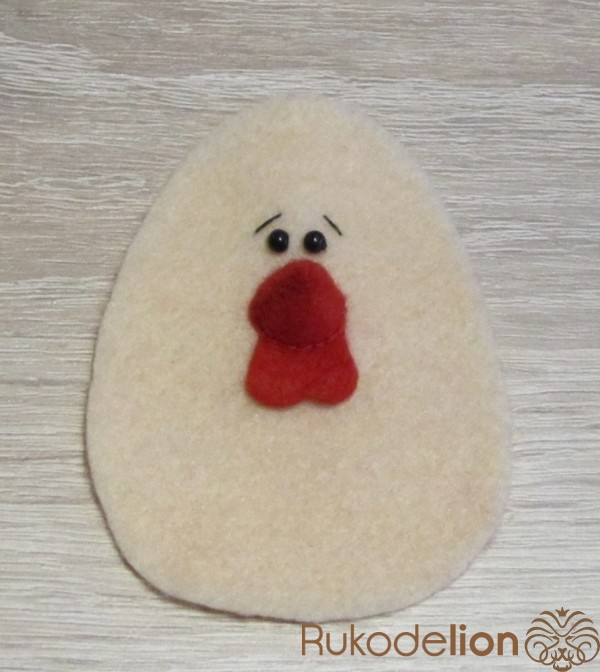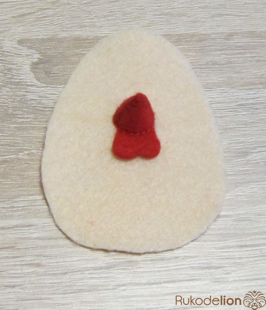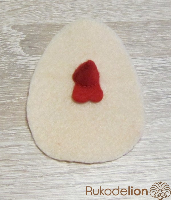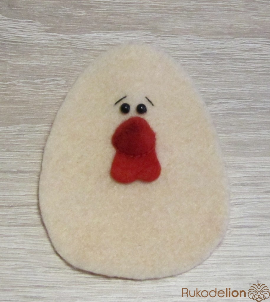 Шьем клювик. Сшиваем вместе детали клювика обметочным швом., оставляя открытым вход. Набиваем наполнителем клювик. Теперь прикладываем к передней детали туловища и пришиваем верхнюю часть клюва. Затем вставляем сережки под нижнюю часть клюва и пришиваем.