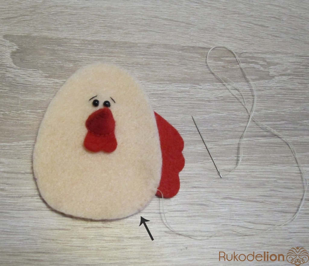 Сшиваем туловище. Начинаем с места, указанного стрелочкой. Затем вставляем крыло в место, отмеченное на выкройке. Сшиваем детали туловища, захватывая при этом крыло. Доходим до гребешка. Вставляем его в указанное место. Из атласной ленты формируем петельку и вкладываем ее между гребешком и задней деталью туловища. Пришиваем гребешок, обязательно захватывая все слои. Аналогично первому пришиваем второе крыло. Шнурок с лапками сгибаем пополам и вставляем снизу туловища. Сшиваем низ туловища, оставив небольшое отверстие. Набиваем игрушку и заканчиваем шов.