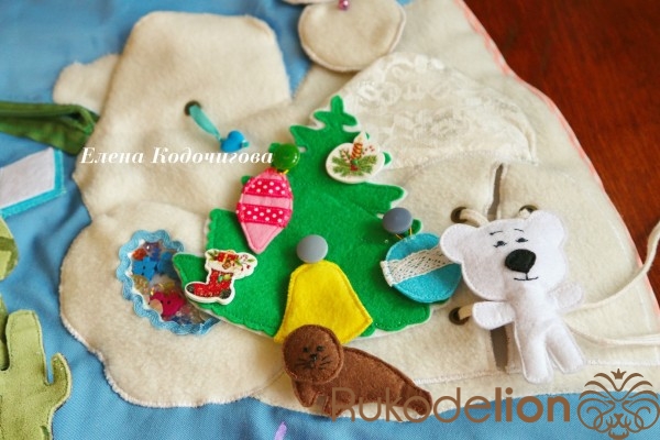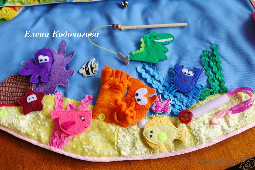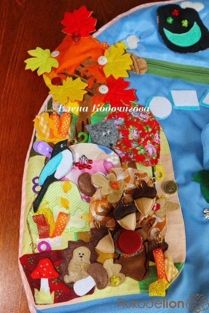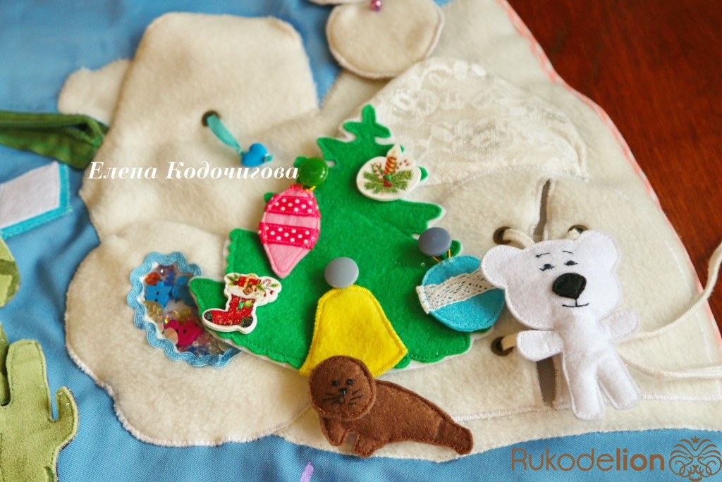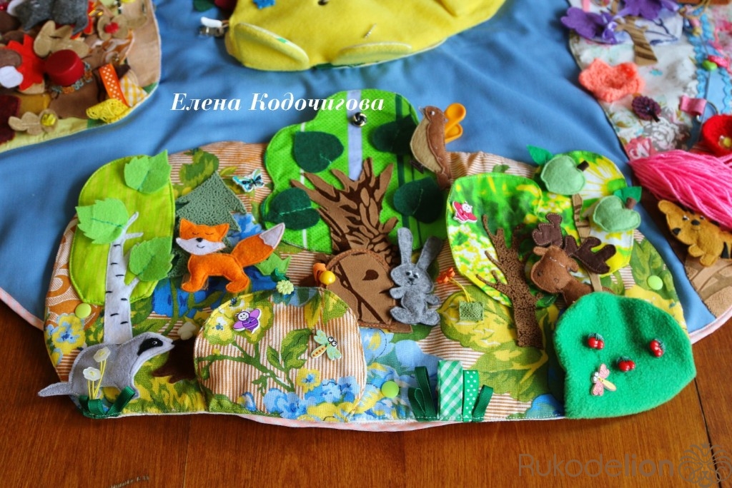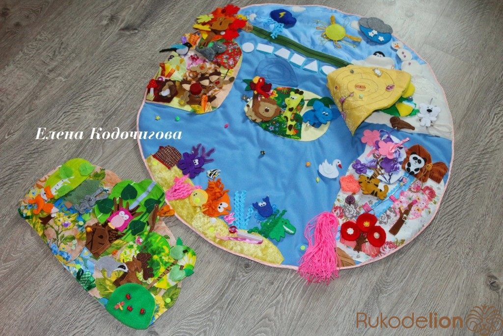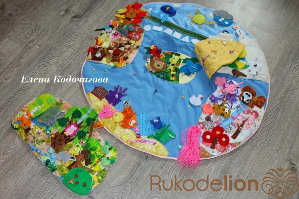 На данный момент это самый большой коврик из сшитых мною)) На коврике поселилось 29 обитателей, среди которых есть животные леса, пустыни, тропиков, Арктики и Антарктиды, а так же жители подводных глубин. На нежном весеннем острове расцвели вязаные и фетровые цветы, а ива так и просит завязать ей косичку.В жаркой Африке в песке спрятались различные предметы, есть счёты, на которых можно считать фрукты, ягоды и листья. Из геометрических фигур малыш может построить мостик от зимнего до осеннего острова, а наряжать ёлочку - это любимое занятие любого ребёнка. Осенний остров пестрит красками. Шуршат деревья, падают жёлуди, ёжик собирает грибы, а малыш поможет ему дойти до своей норки по цифрам-шнуровке. Летний остров тёплый, солнечный и зелёный. На нём всё растёт и грибы, и ягоды, и яблоки. Здесь мы ищем пары каждому жучку и бабочке. На небе можно увидеть радугу, если поставить вместе дождик и солнышко, или устроить ночь с помощью месяца и звёзд, а можно и просто устроить метель. Прищепки, пуговки, молния, карабины, пряжки, всевозможные виды кнопок и крючков, искалка, лабиринт, крестики-нолики - далеко не весь список заданий. С таким ковриком любой малыш сможет надолго увлечься игрой и окунуться в мир сказок и фантазий.